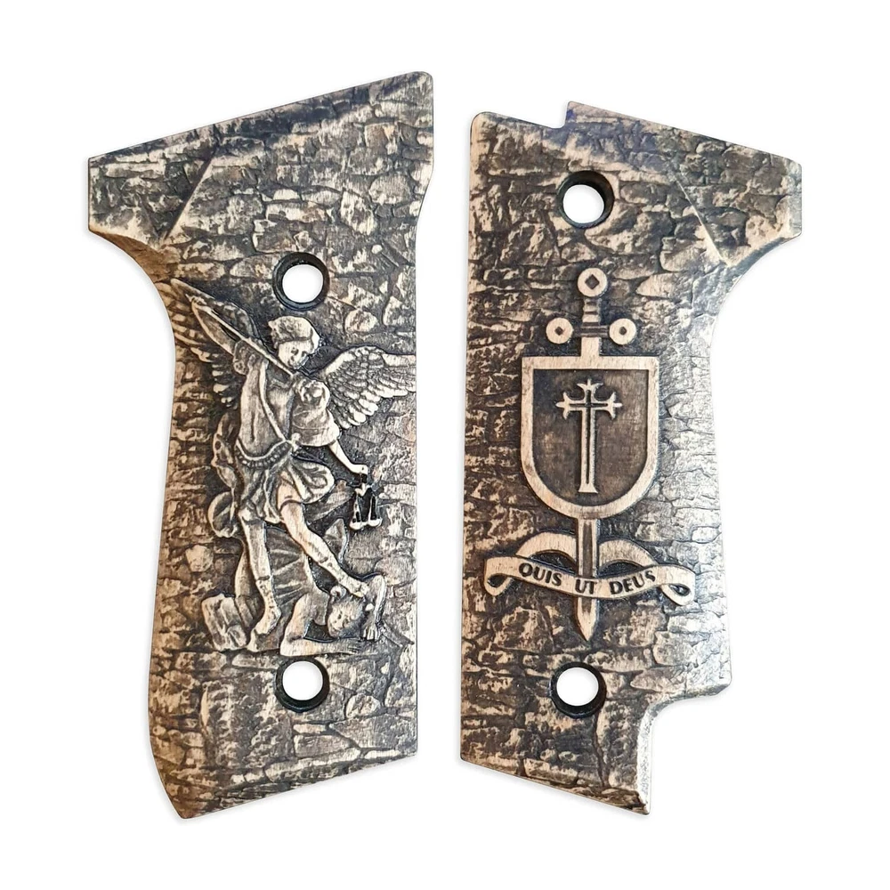 New Beretta 92S grips with "Quis Ut Deus" design. Carved from solid natural wood - Cut by CNC. Grinded, painted and oiled by hand