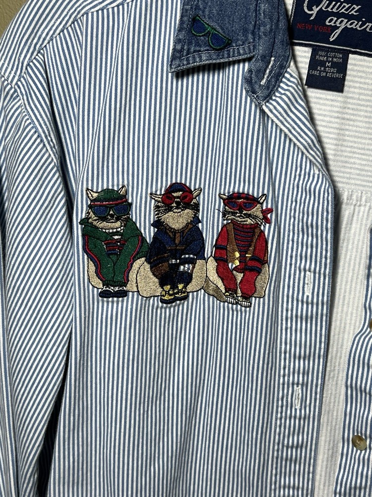 Let’s Quizz Again New York shirt with embroidered cats wearing sunglasses and hoodies. Vintage (late 90s- early 2000s) women’s Medium light blue striped denim button down. I think this fits a bit oversized, so size large would fit this shirt too.