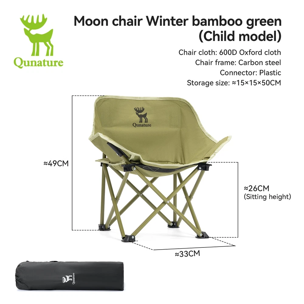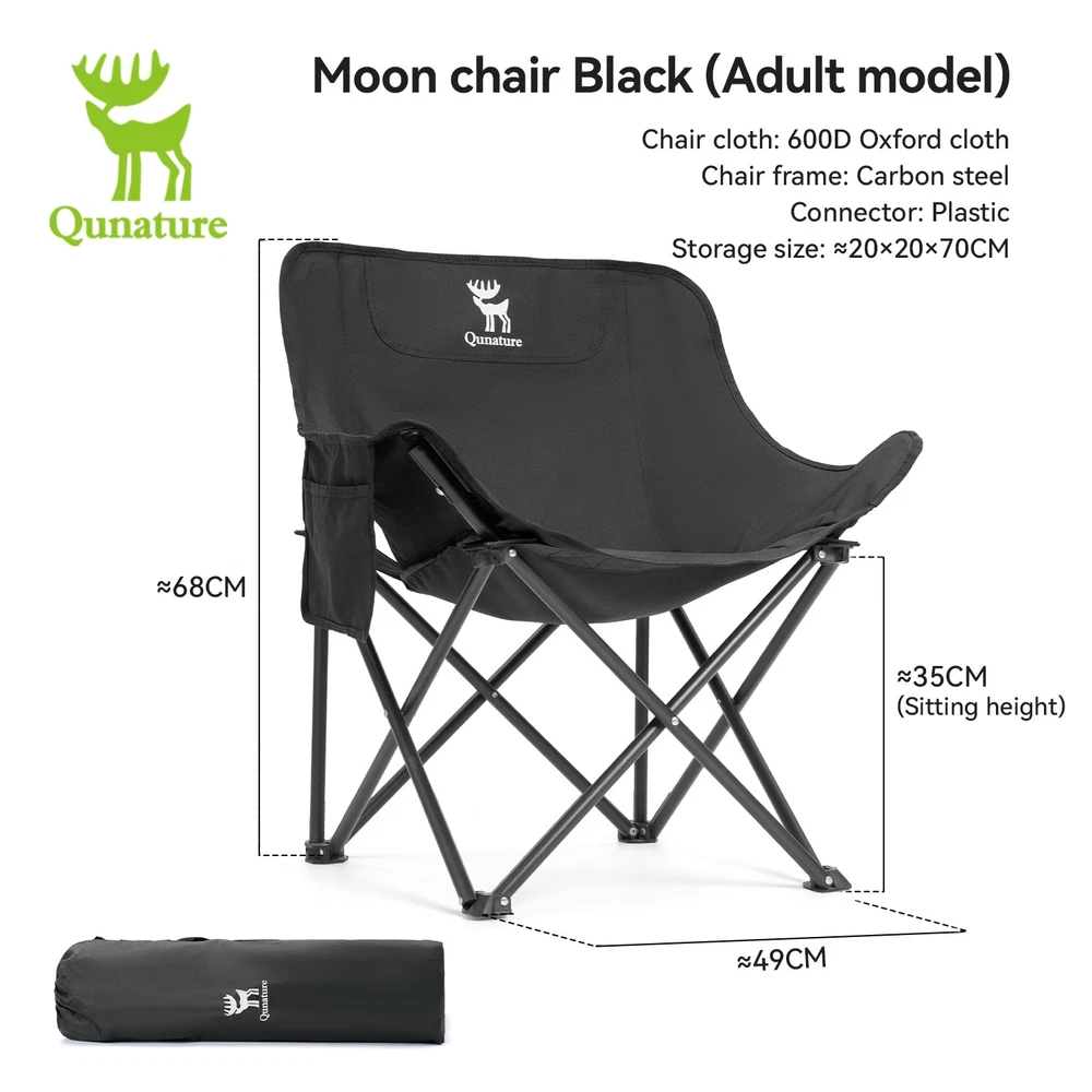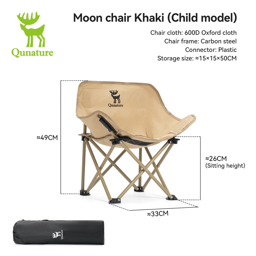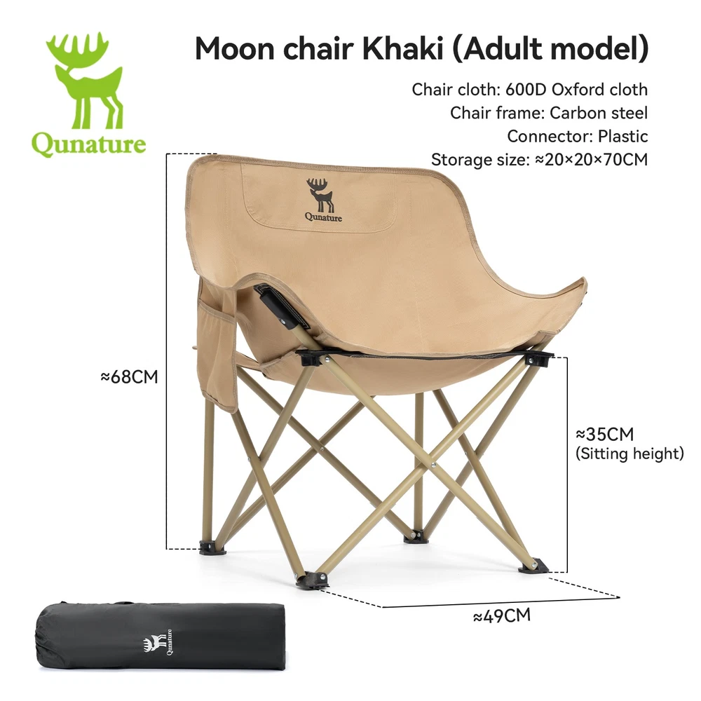 Product Information Brand:Qunature Name:Outdoor portable folding moon chair Material:600D Oxford cloth + Carbon steel + Plastic Color:Adult model:Black/Khaki,Child model:Winter bamboo green/Khaki Load-bearing:Adult model-120kg,Child model-60kg Weight:Adult model-2kg,Child model-1kg Product features. 1、 The chair surface is widened as a whole and the seat cloth fits the curve of the human body to provide better lumbar support 2、Thickened and reinforced steel pipes cross-shaped support for stable load-bearing, making it safer for children to use 3、High-strength oad-bearing,Thickened pipe diameter 4、Quickly gather& store Travel more convenient,No need for tools to install expand and sit, fast storage 5、 Large-capacity storage pockets on the sides and backrest for easy storage of belongings