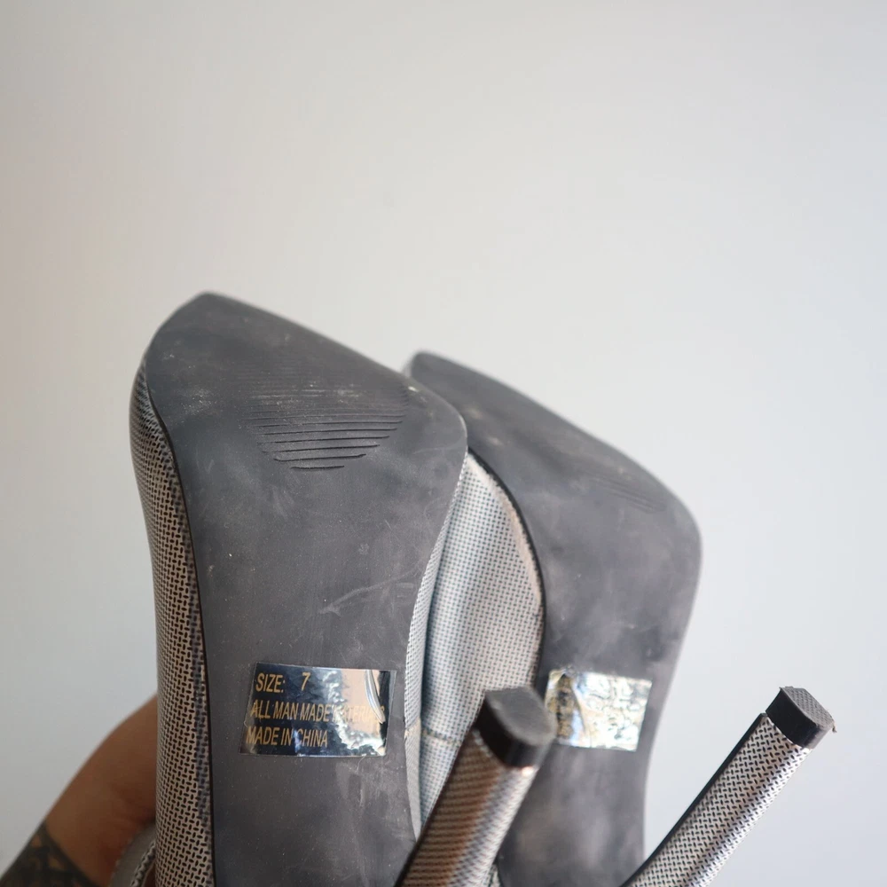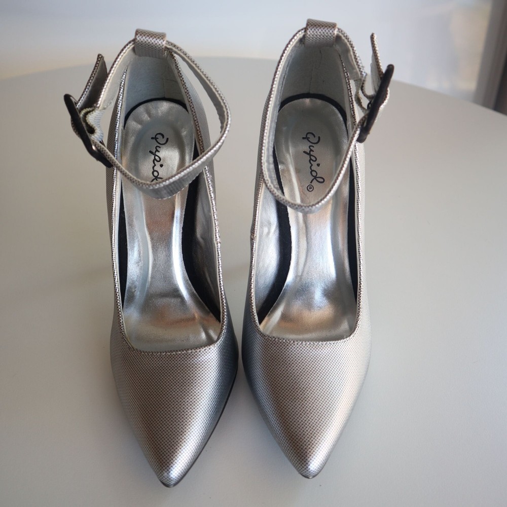 These Qupid pumps offer a sleek silhouette with a textured silver finish, designed for a sophisticated touch to any ensemble. The sturdy ankle strap with buckle provides secure wear, while the pointed toe and high heel elevate the look with elegance. • Pointed toe design • Ankle strap with buckle • Silver textured finish • High heel style • Secure fit Heel height approximately 4 inches. Size: Womens 7 Condition: Pre-Owned Good
