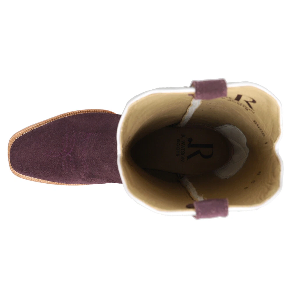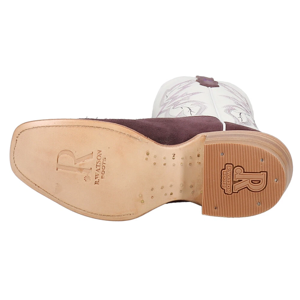 Rough Out Plum Embroidered Narrow Square Toe Cowboy Boots Product Details Leather upper Solid steel shank Stacked leather heel Leather outsole Heel Height 1 1/2 Inch, Shaft Height 13 Inch R. Watson presents these plum rough out and winter white cowhide western boots. These boots have a 10 row stitch pattern, R. Watson comfort system, all leather stacked heel, counters, solid steel shank, and 10 iron outsole. 13 inch total in height. Additional Details Color: White Occasion: Casual Gender: Womens Age: Adult Brand: R. Watson Boots
