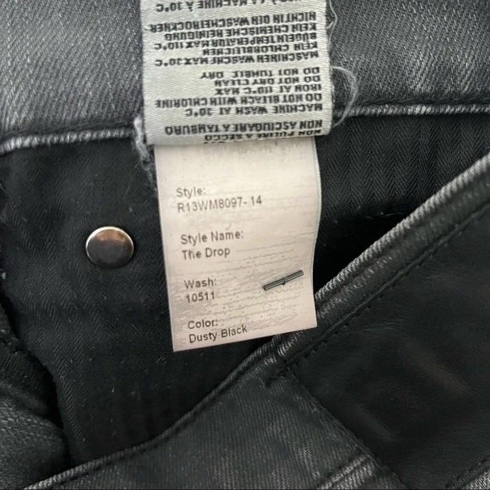 R13 Women's The Drop Dusty Black High Rise Skinny Ankle Jeans Size 25 Fabric: Stretch denim Drop crotch and cropped profile Single-button closure and zip fly 5-pocket styling Approximate Measurements taken flat: waist 15, rise 12, inseam 27 Pre-owned; in excellent condition. No rips, stains or holes. Minor wash wear- noticeable from color transfer on interior tags/labels. Please see all photos for condition details.