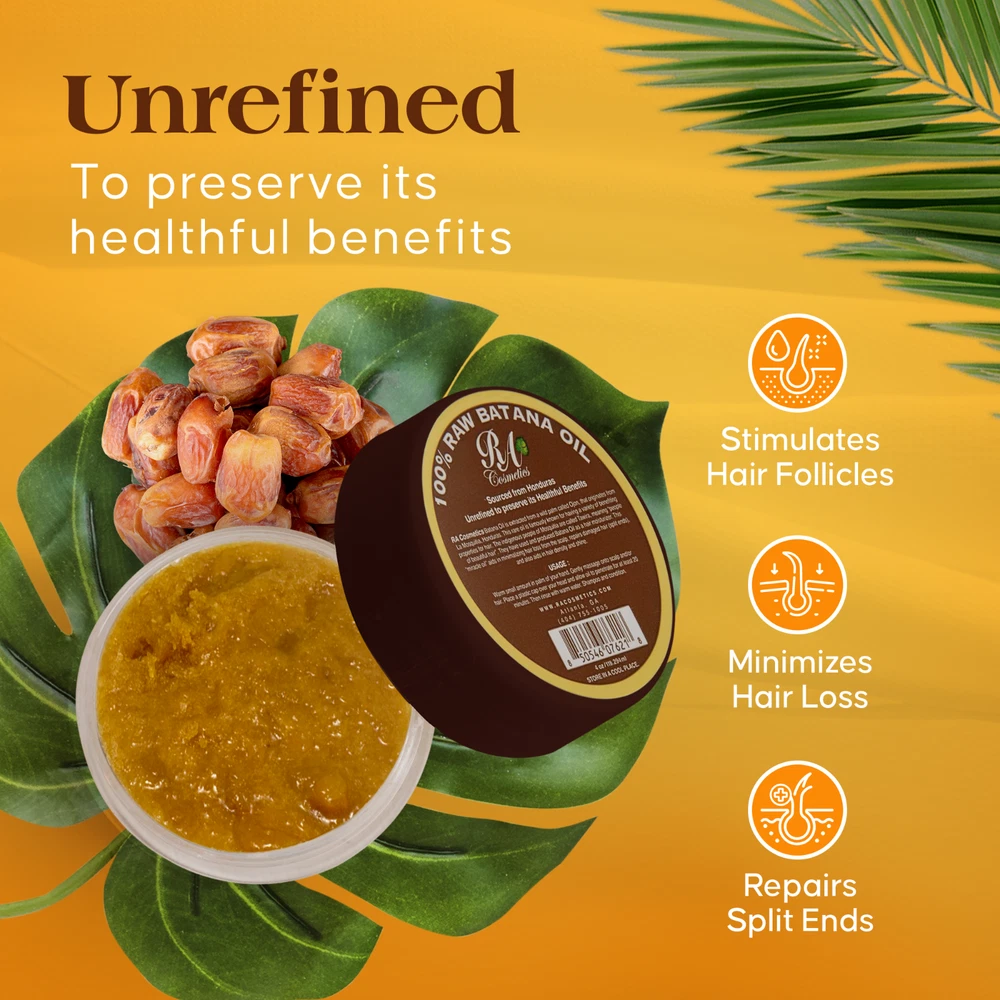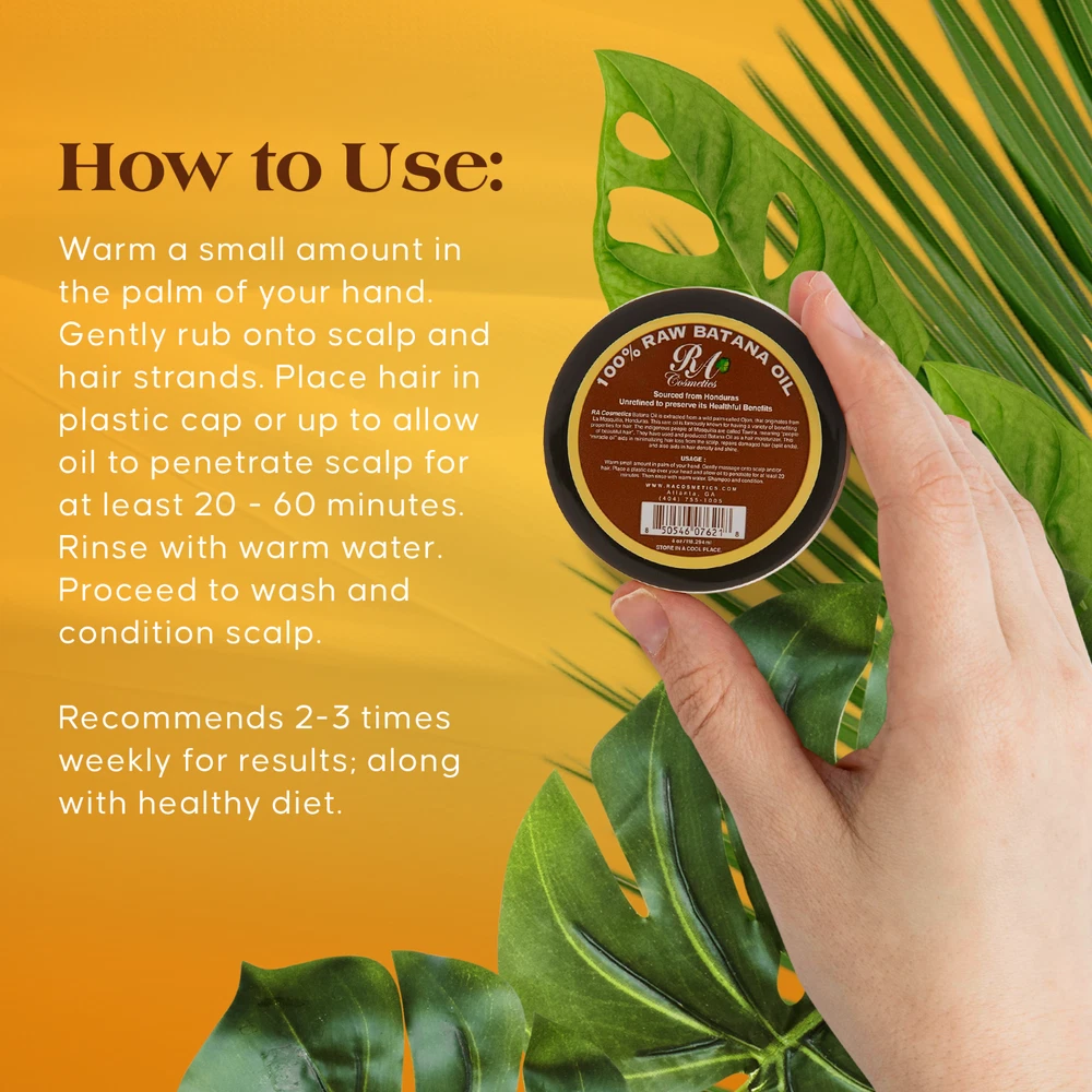 Nourish Your Hair Naturally: Experience the power of RA Cosmetics 100% Natural Batana Hair Oil, sourced from Honduras. This unrefined oil is packed with vitamins, derived from the nut of the South American Palm Tree, providing your hair with natural nourishment. Hair Strength and Vitality: Elevate your hair care routine with our Unrefined Batana Oil, known for its ability to strengthen and nourish hair. Restore vitality to your locks while controlling hair breakage and promote overall hair health with our natural solution. Versatile Daily Moisturizer: Pamper your hair and scalp daily with Batana Oil as a moisturizer. Its lightweight yet deeply penetrating formula provides a natural sheen and hydration, leaving your hair feeling soft and manageable. Indigenous Beauty Secret: Uncover the beauty secret that has been passed down through generations among South American indigenous peoples. Batana Oil is not just a product; it's a tradition of care and nourishment that brings you closer to the roots of natural beauty. Intensive Oil Treatment for Luxurious Locks: Unlock the secret to luscious, radiant hair by incorporating Batana Oil into your deep conditioning routine. Warm a small amount, massage onto the scalp and hair, and let the oil work its magic. Rinse after 20 minutes for a salon-like treatment at home