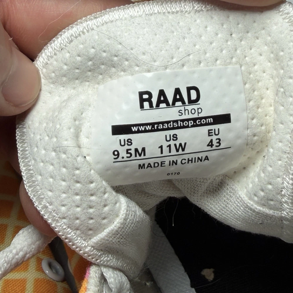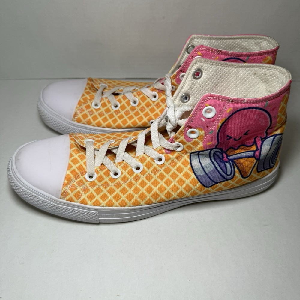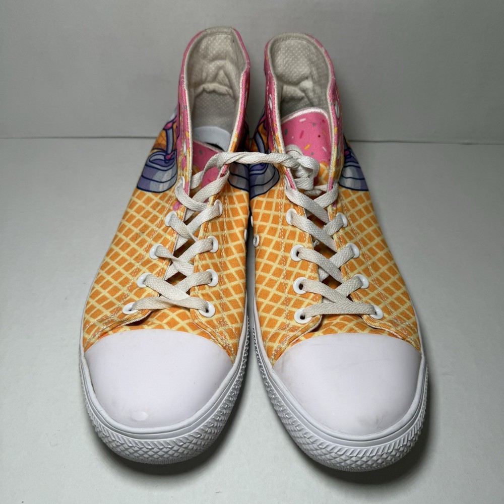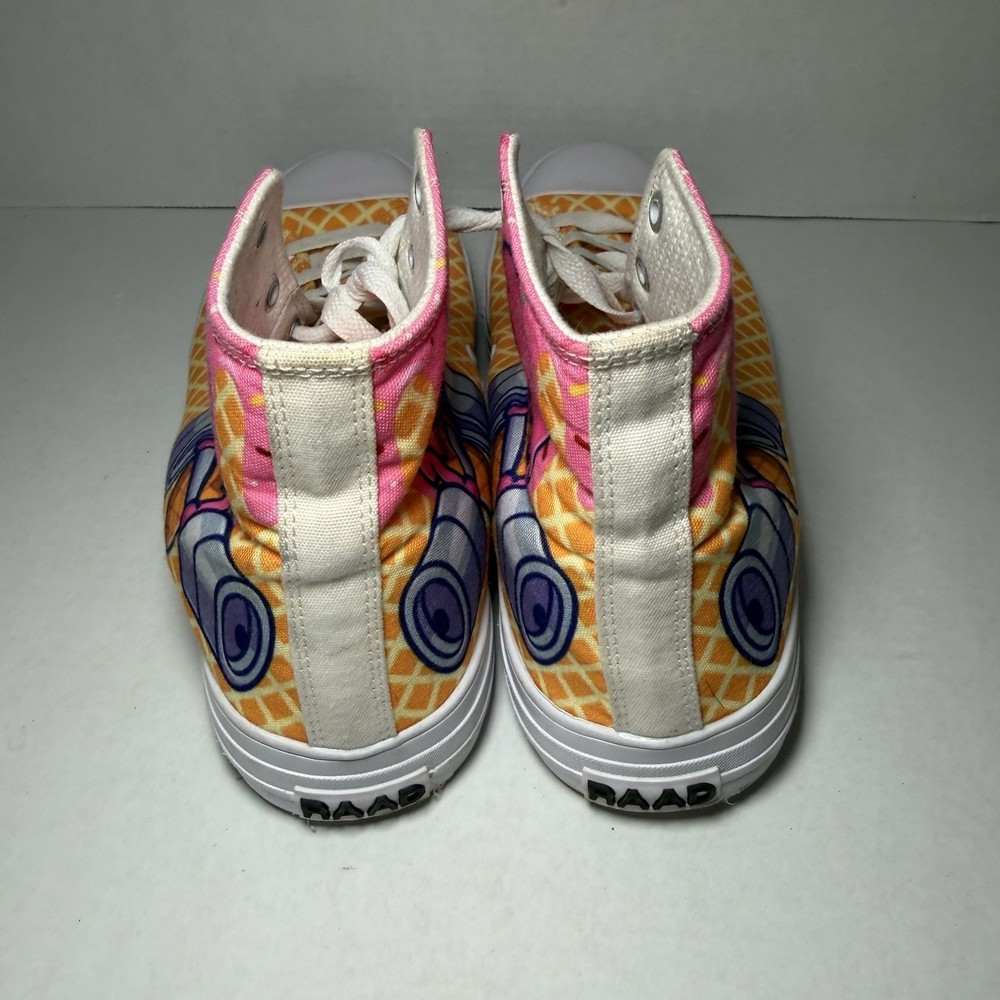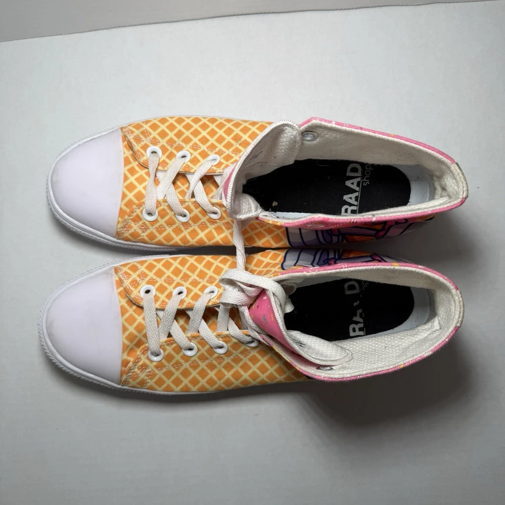 The RAAD Shop High Top Sneakers Shoes are a unique and sought-after pair of athletic shoes designed for weightlifting. Featuring a waffle cone ice cream theme, these pink sneakers with a lace-up closure offer both style and functionality for the active individual. The high-top design and standard shoe width make them comfortable for long workouts, while the brand's reputation for quality ensures durability. Ideal for men looking for a rare and eye-catching addition to their sneaker collection, these RAAD sneakers are sure to make a statement. Men’s 9.5 - women’s 11