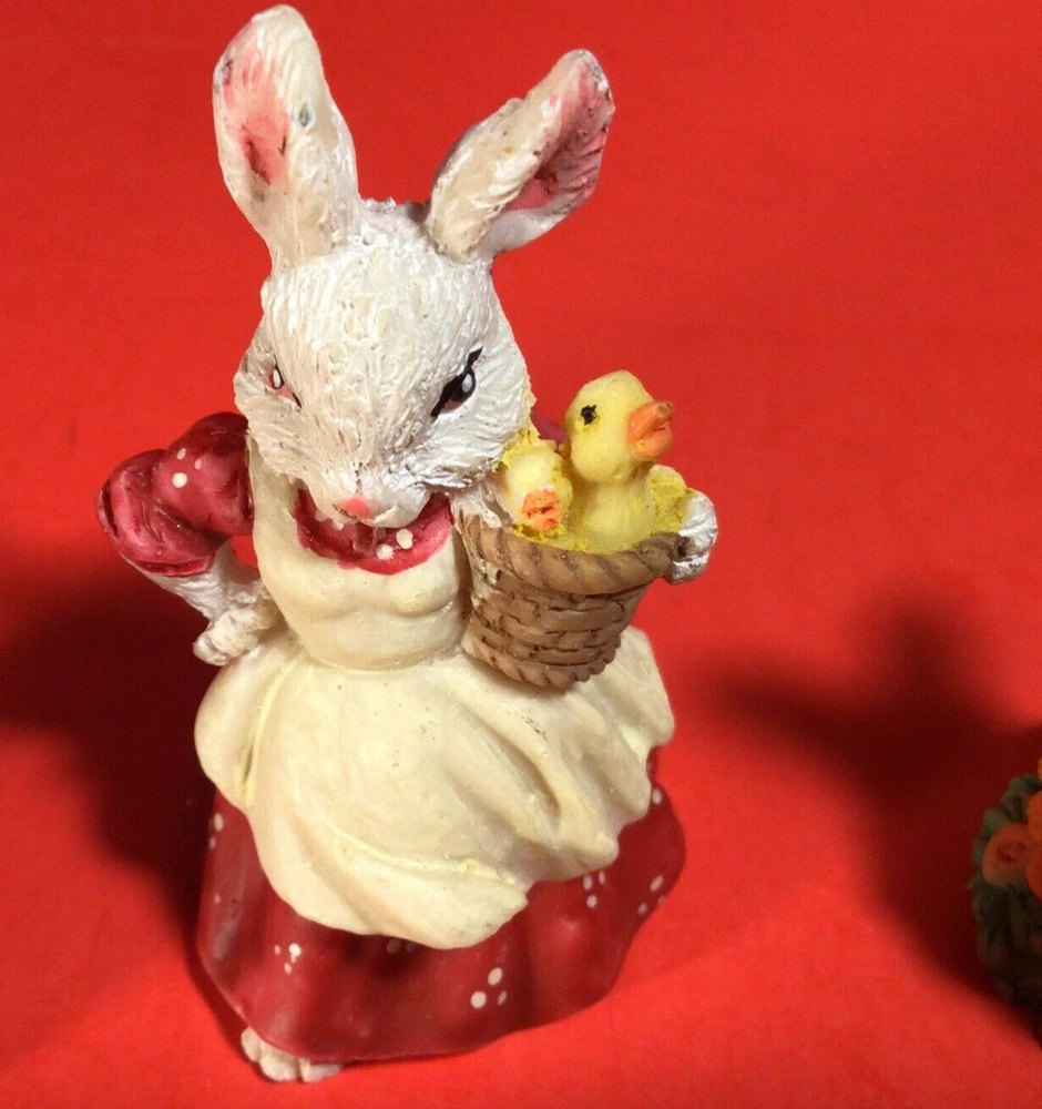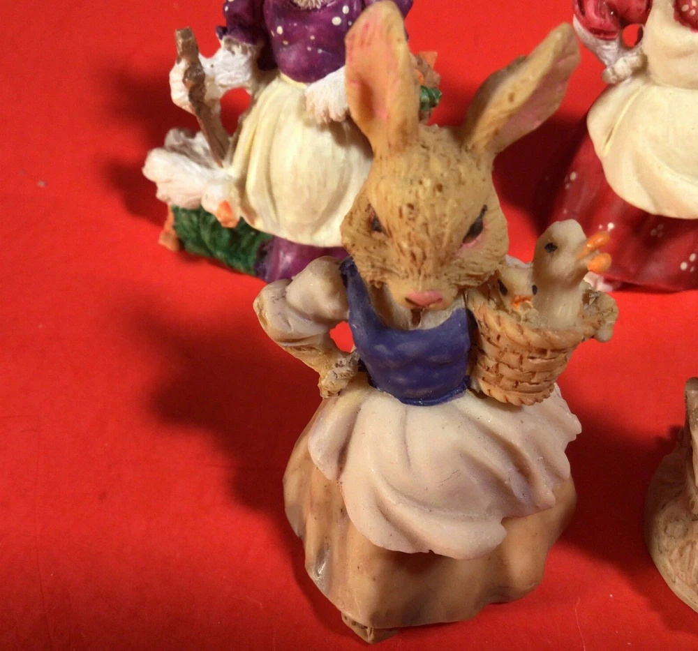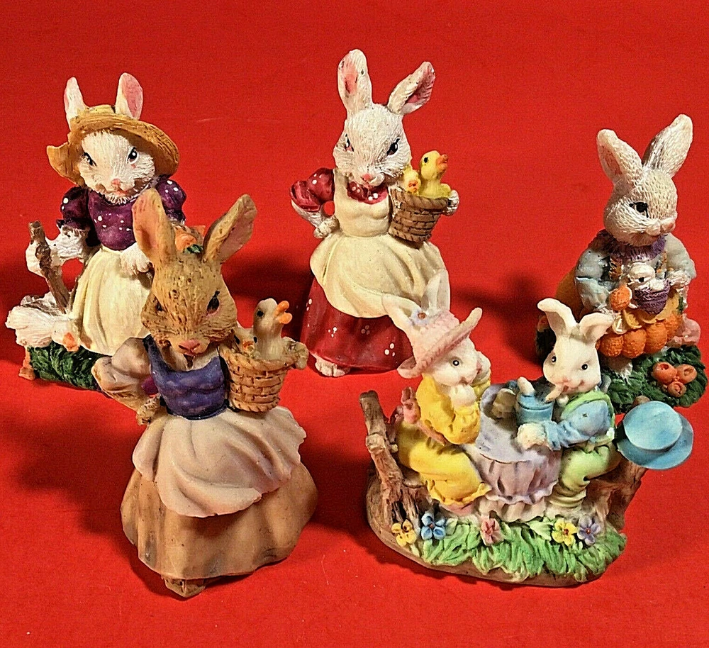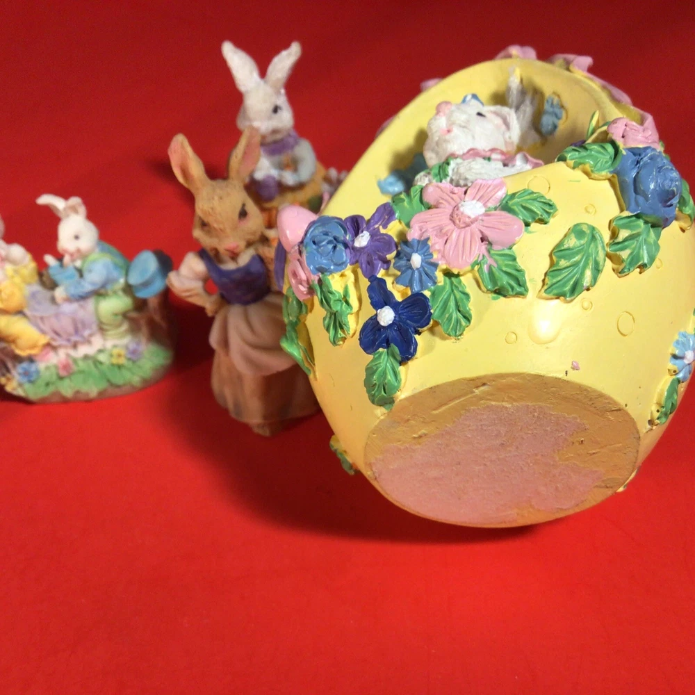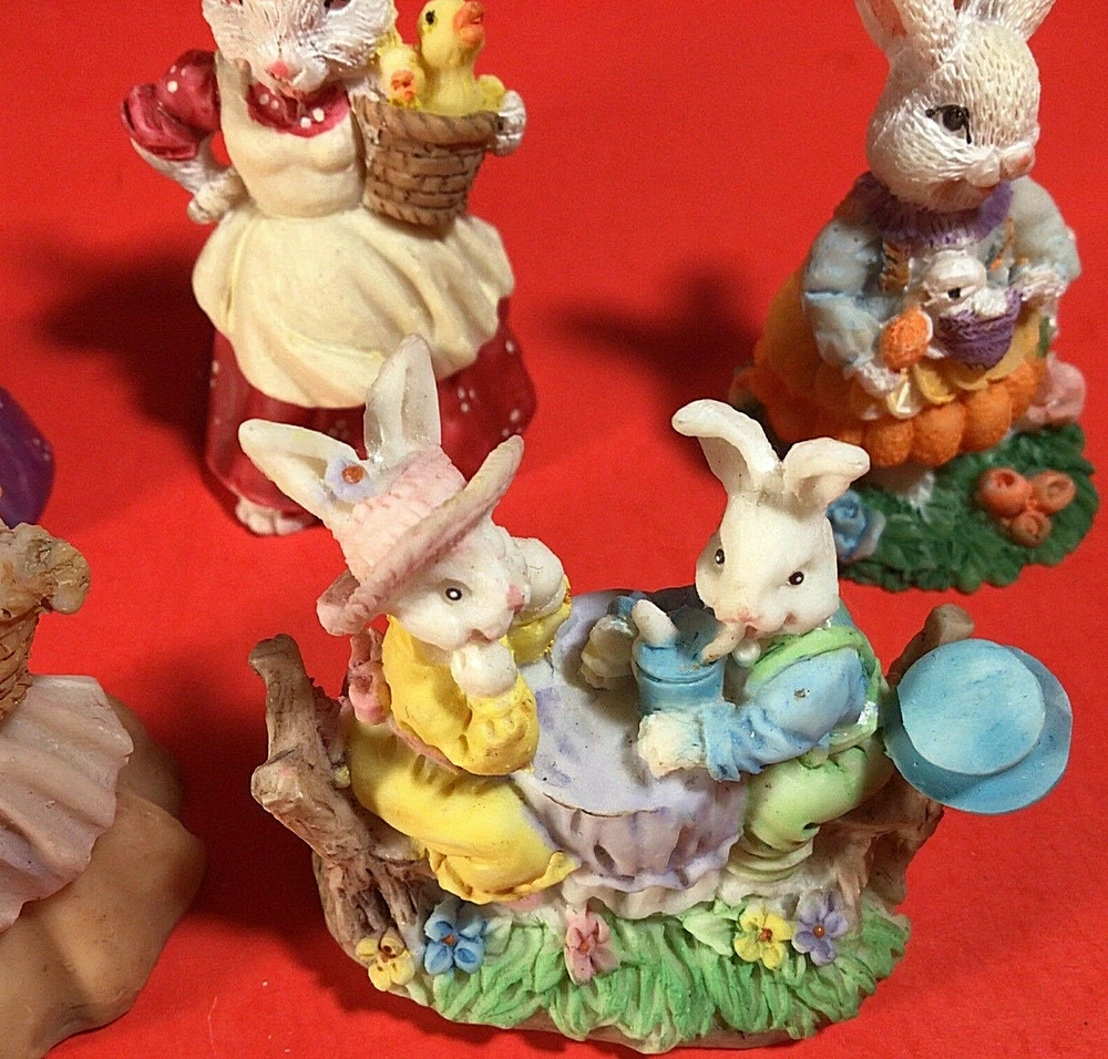 LOT OF EASTER BUNNY RABBITS. EGG WITH BUNNY INSIDE 4 INCHES HIGH. 5 LITTLE DRESSED UP BUNNY RABBITS. THEY RANGE FROM 1 3/4 TO 2 1/4 INCHES TALL. 1 BUNNY HAS A LITTLE CHIP ON HER HAT. I DON'T SEE ANYMORE. THEY ARE ADORABLE. POSSIBLY RESIN BUT NOT SURE? IF YOU HAVE ANY QUESTIONS OR WOULD LIKE MORE PHOTOS PLEASE MESSAGE US. THANK YOU SO MUCH FOR SHOPPING WITH US! WE ENCOURAGE YOU TO CHECK OUT OUR CUSTOMER REVIEWS. CHECK OUT AND FOLLOW OUR STORE FOR MORE GREAT ITEMS AS WE ADD TO OUR INVENTORY ALMOST DAILY. http://stores.ebay.com/wootieswonders THANKS AGAIN. KEN AND CAROL