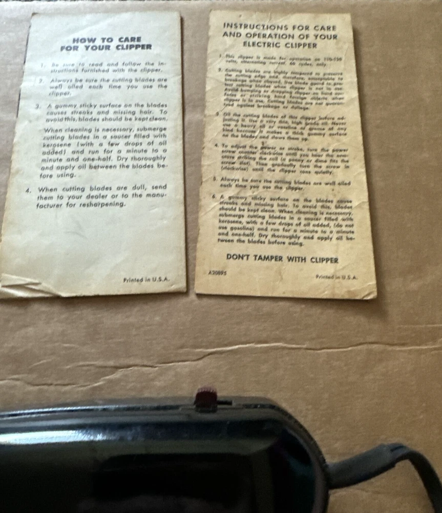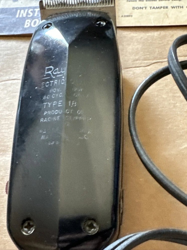 VINTAGE RACINE ELECTRIC CLIPPERS TYPE 18. RACINE, WIS. MADE IN U.S.A. SERIES A. Vintage pieces are not new, and there may be imperfections and wear, please take care to view photos carefully before purchase. Please read the description and view all of the pictures so you are aware of the size and condition of the items listed. I do my best to represent all items accurately. As pictured - I use my own photos. Please look at pictures closely as they are part of the description. Smoke Free Environment US: Fast Shipping with Tracking Provided International: Via eBay International Shipping Program Only Make sure your mailing/shipping address is correct before you submit your order. I won't reship an item for free. This item will be packed with extreme care to insure a safe arrival to its new home. Items may ship with recycled materials. Feedback is very important to us. We strive for 5 stars! Once you receive your item, we ask that you leave feedback for that item. This allows us to know if you are happy with your transaction. In return we will leave feedback for you. Check Out My Other Listings