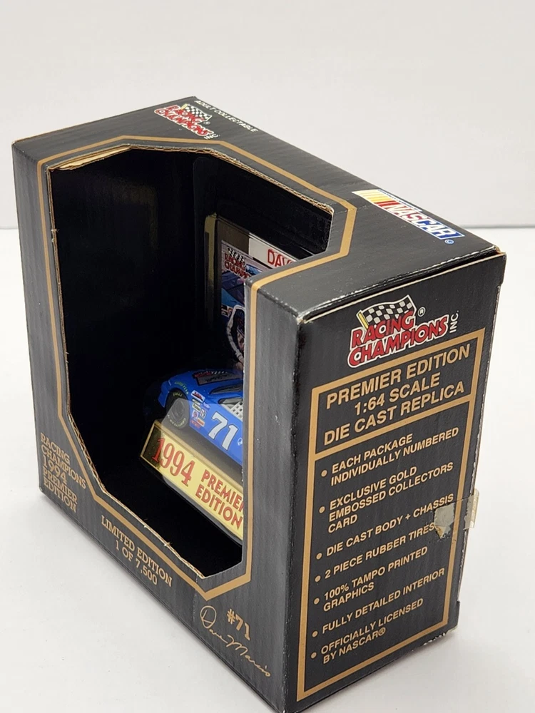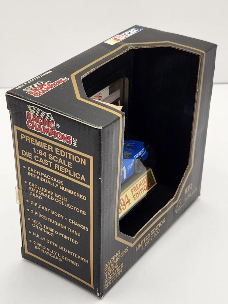 Rev up your NASCAR die-cast collection with this vintage Racing Champions Dave Marcis #71 Premier Edition/Limited Edition(1 of 7,500)(Serial #04529) 1:64 Scale Car which is complemented by the Racing Champions Dave Marcis gold embossed collector's card that bares his image included. This stellar reproduction of the 1994 Dale Earnhardt Chevrolet , Chevrolet Lumina , is diecast perfection. Each detail is captured in this limited edition model, from the sleek blue exterior to the fully detailed interior, all showcased in a scale that's perfect for display. This collectible comes with a bonus Dale Earnhardt Chevrolet Emblem Decal , matching the logo on the car hood, adding an exclusive touch to your collection. This is a unique tribute to the legacy of Dave Marcis . So please don't miss out on this opportunity. These items are NASCAR VINTAGE Collectibles and are sold as such. I try to describe the item as accurately as possible. Please note that these are in Great Vintage condition for their age . There may be small blemishes here and there on the packaging. (Refer to pictures above) PLEASE REFER TO ALL PHOTOS ABOVE TO DETERMINE THE CONDITION OF ITEM AND THAT IT MEETS YOUR OWN SATISFACTION. THE PHOTOS ARE CONSIDERED TO BE PART OF MY OVERALL DESCRIPTION. I have more fun/cool items at Smittyz Oddz Endz n Collectablez . Please visit and 'favorite' my store at: https://www.ebay.com/str/smittyzoddzendzncollectablez Thank you for stopping by and viewing my page.