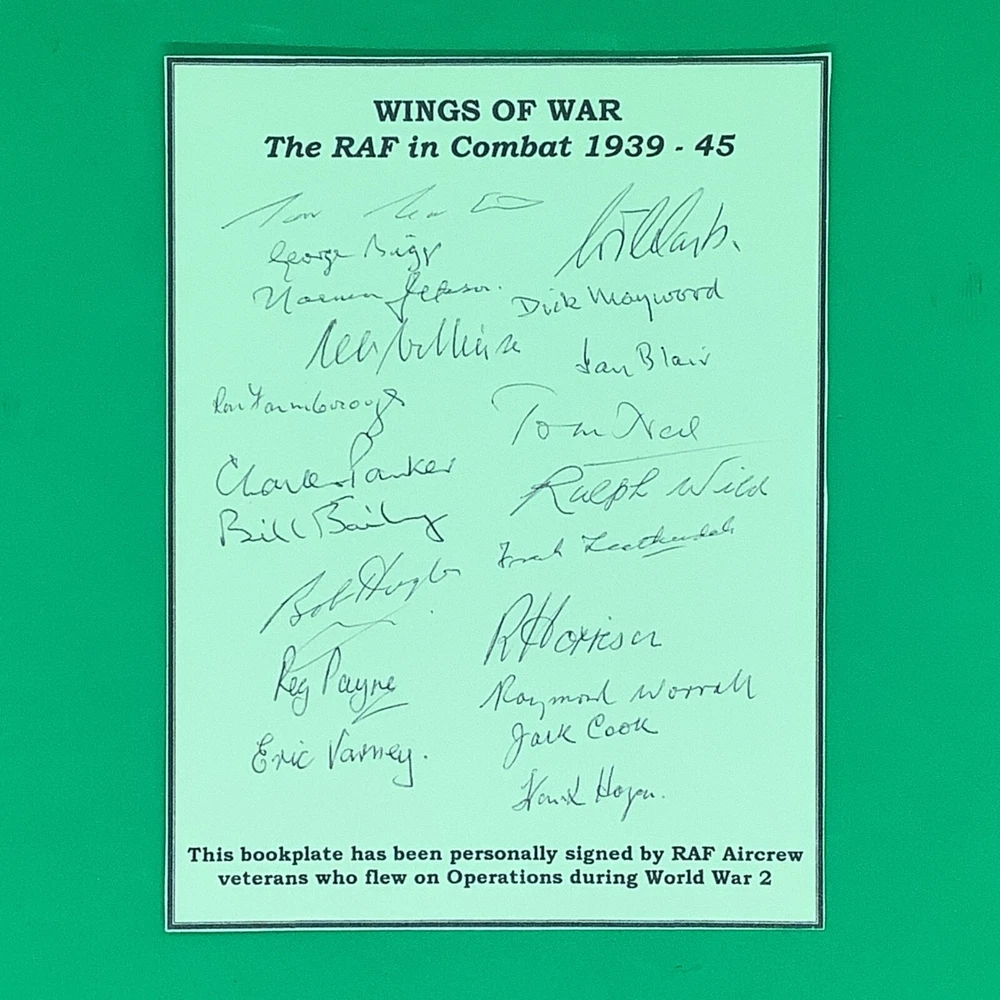 Bookplate autographed by 20 World War Two Royal Air Force combat aircrew veterans. I am selling my WWII memorabilia collected over 40 years. Most of the items are signed and include veterans from all major combatants - the United States, Britain, Germany and Canada - and all service branches - Army, Navy, Air Force and USMC. Please check back as it will take some time to list everything.