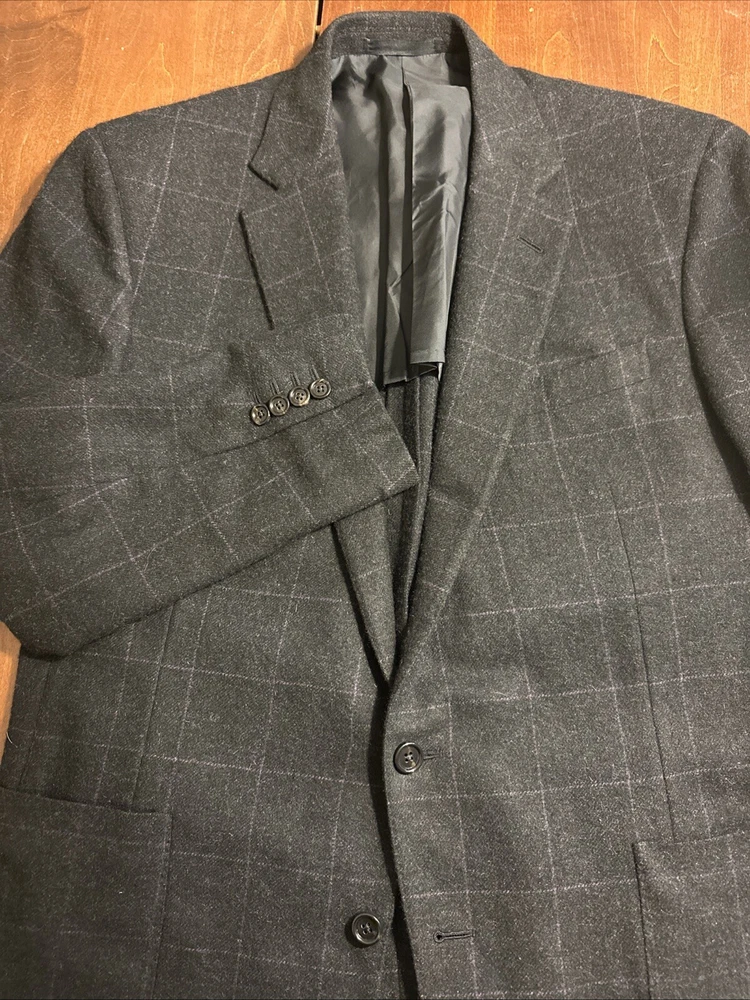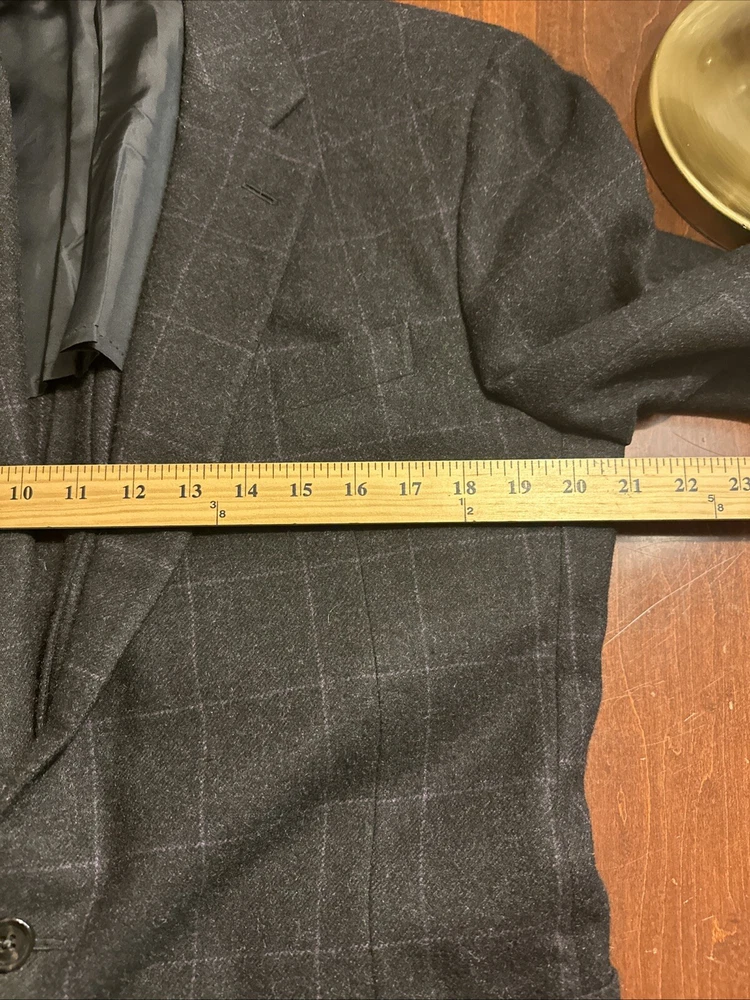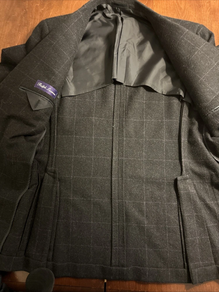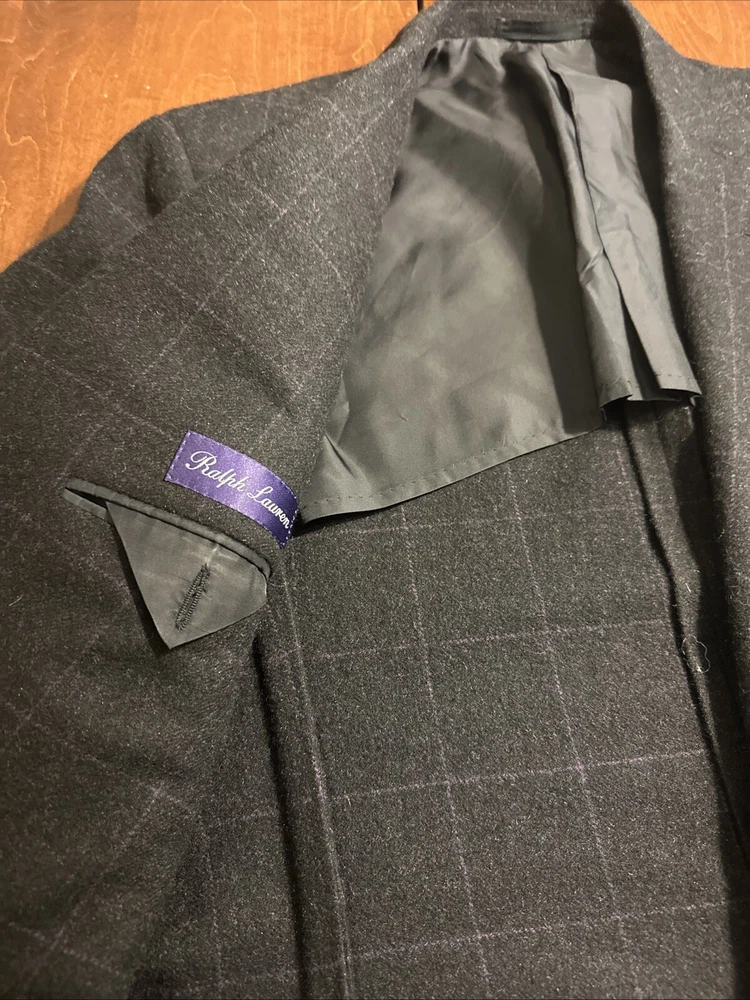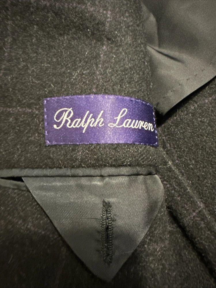 Preowned in excellent condition Ralph Lauren purple label 100% cashmere sport jacket suit, blazer 42R Black in window pane pattern UnStructured Measurements are photographed Sleeve length measured from shoulder seem 25 inches Armpit armpit 21 inches Jacket waist 20 inches Jacket length measured from bottom of collar, 30 inches Shoulder to shoulder 19 inches