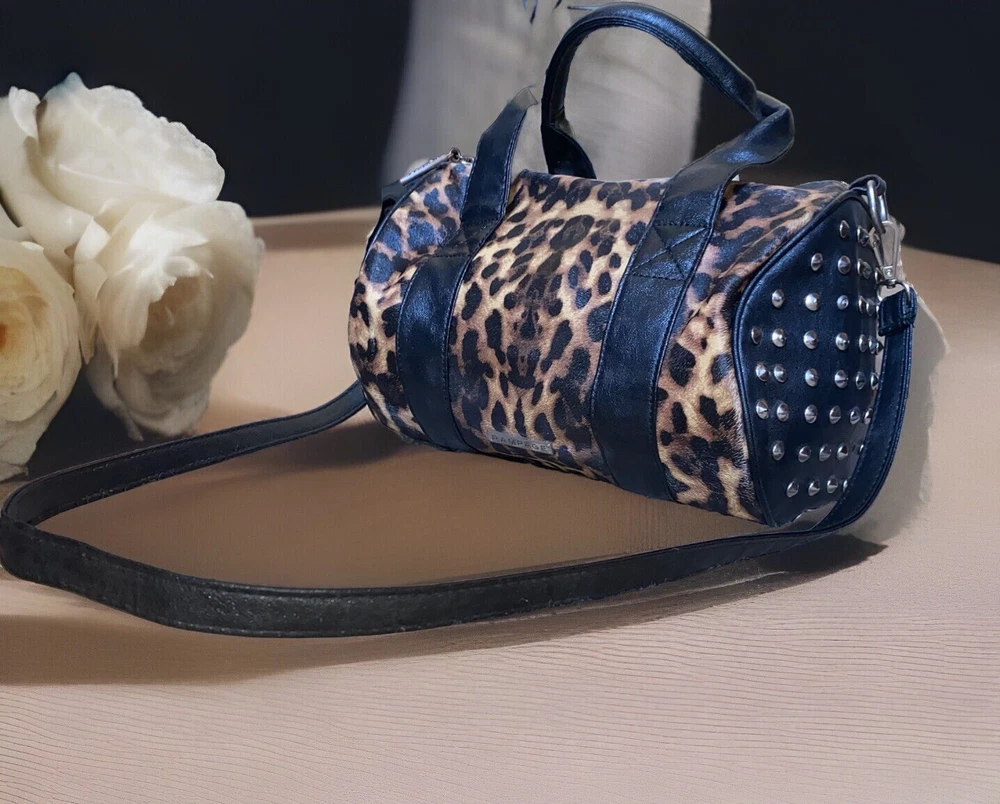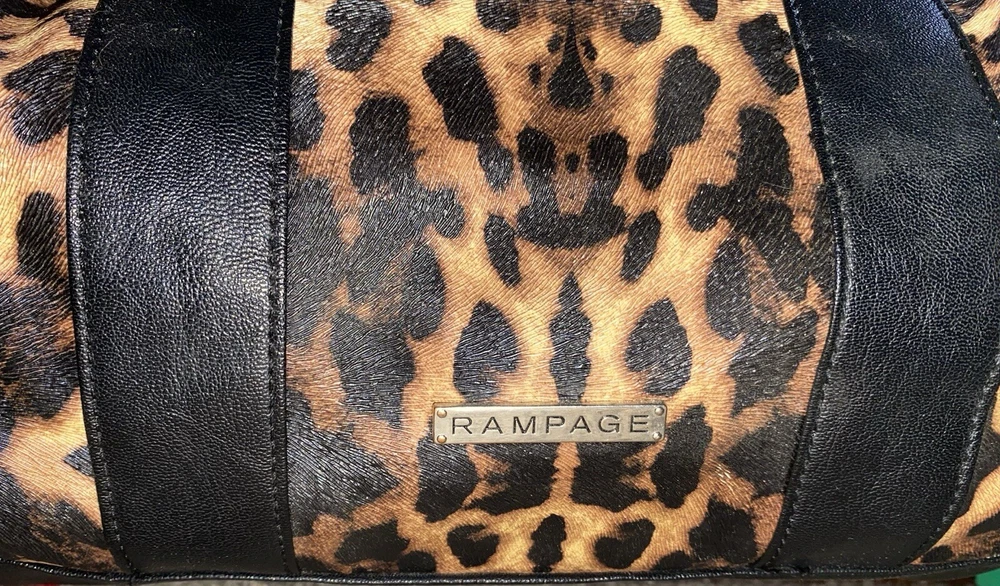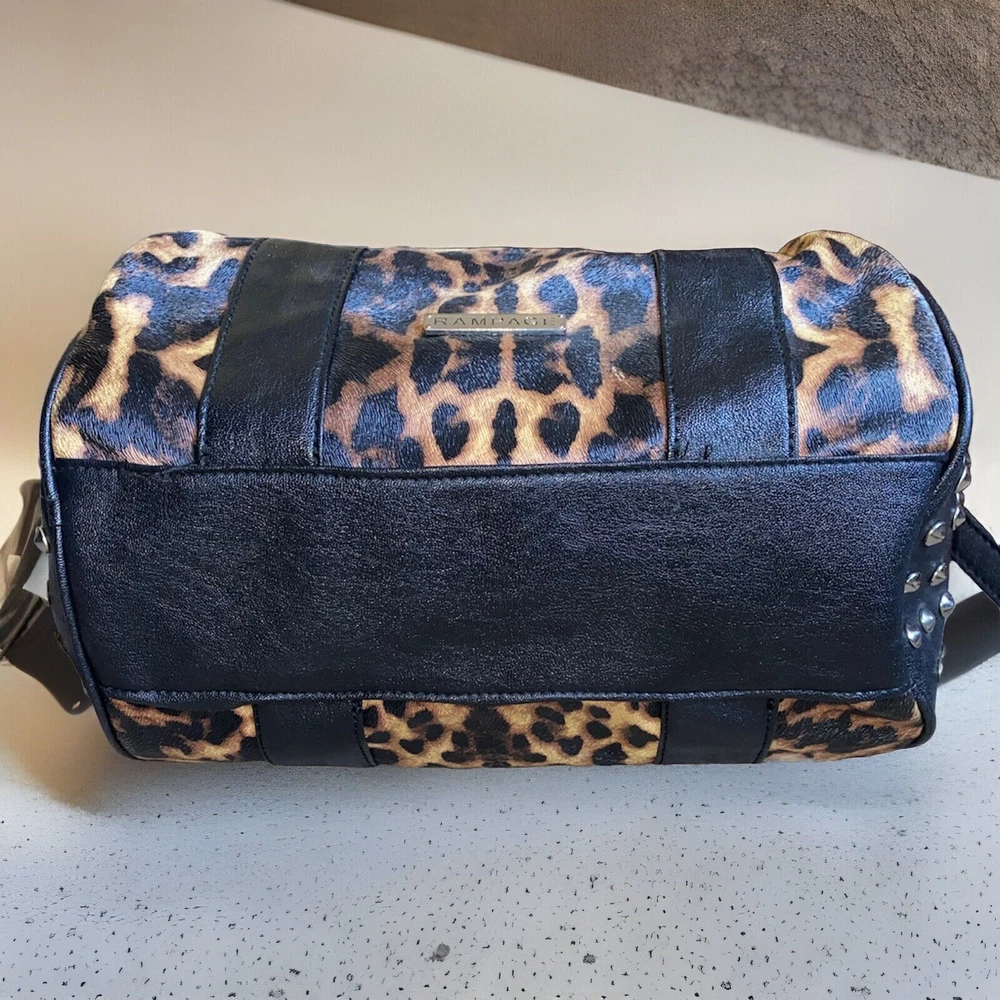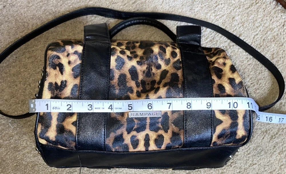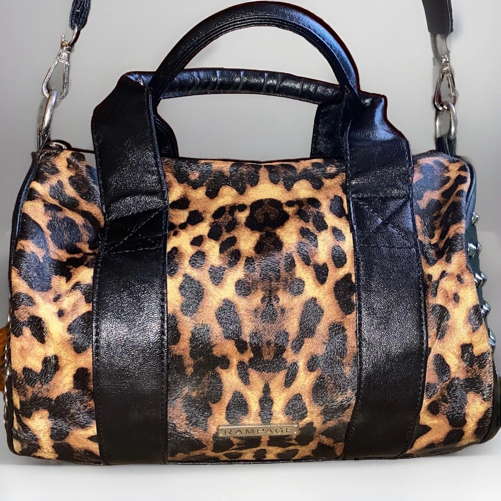 Unleash your punky glam side with this super cute leopard print studded Boston satchel bag with detachable crossbody strap by Rampage!! Details: • Condition: Very Good • Brand: Rampage • Style: Boston bag • Vibrant leopard printed exterior with black handle strap accents • Interior: Black fabric lining with zipper pocket & slip pockets • Silver tone hardware • Silver stud grommets on both ends • Black rolled double top handles • Black detachable crossbody strap with silver clips Measurements (approx): • W: 11” • D: 4” • H: 8” Make me an offer!!