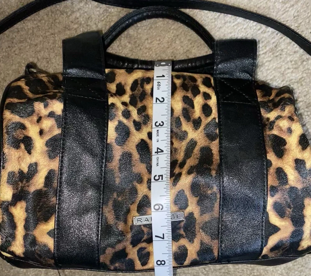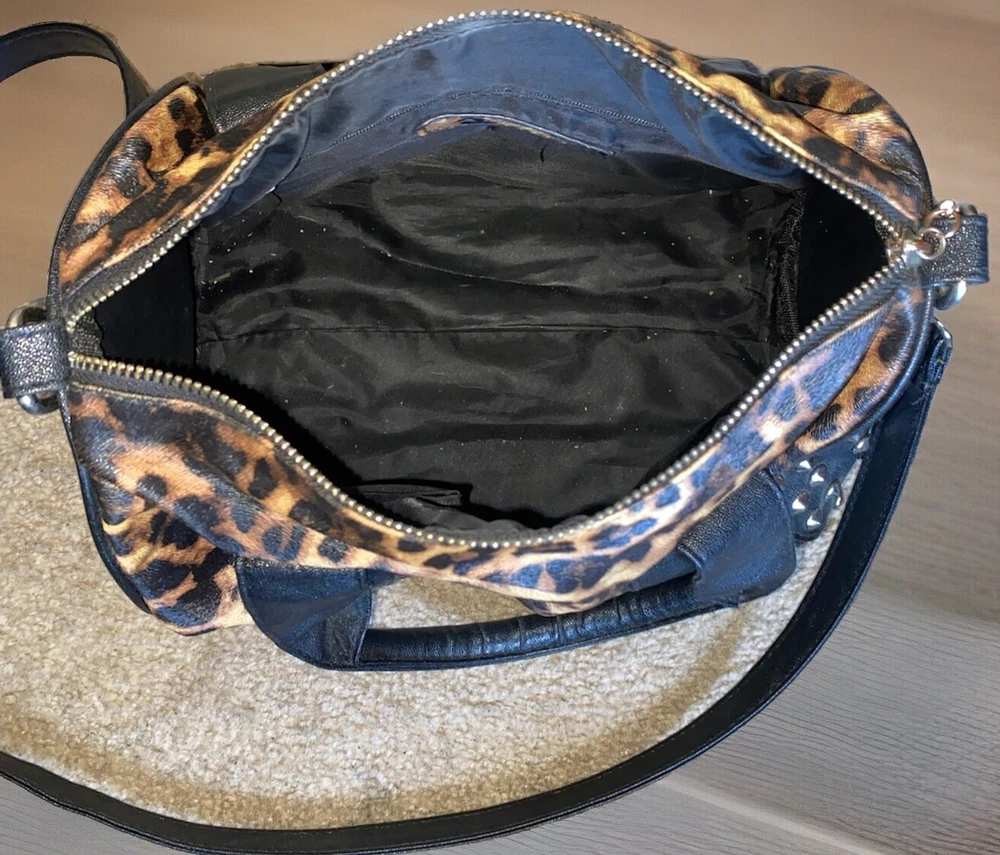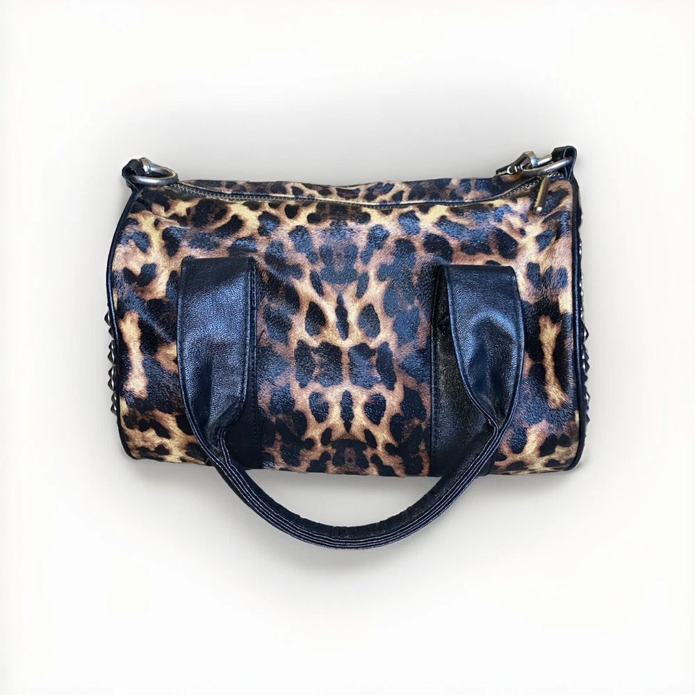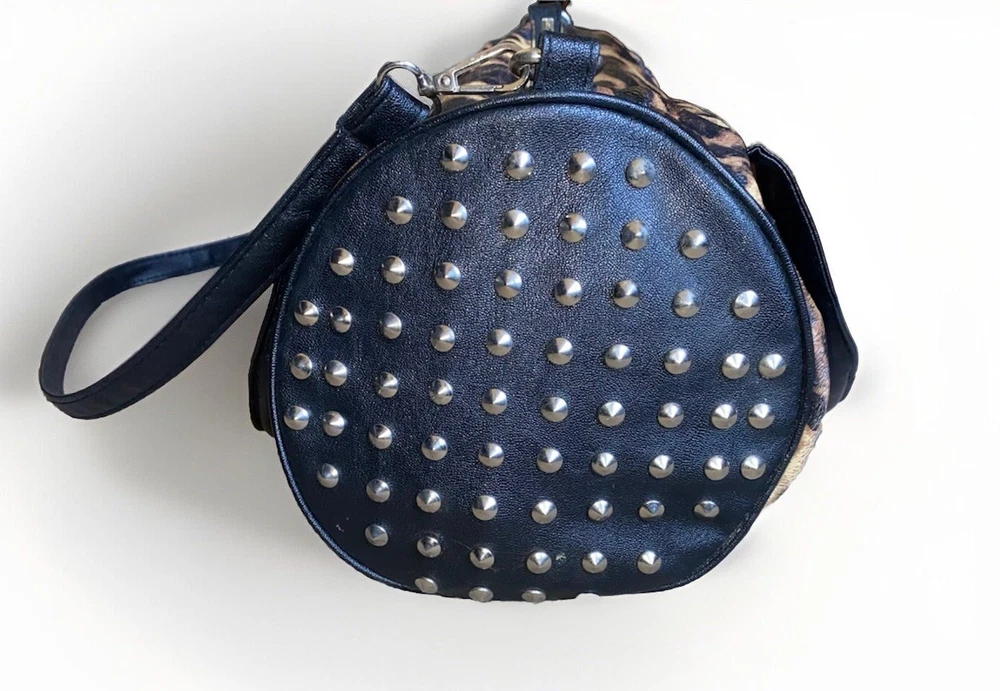 Unleash your punky glam side with this super cute leopard print studded Boston satchel bag with detachable crossbody strap by Rampage!! Details: • Condition: Very Good • Brand: Rampage • Style: Boston bag • Vibrant leopard printed exterior with black handle strap accents • Interior: Black fabric lining with zipper pocket & slip pockets • Silver tone hardware • Silver stud grommets on both ends • Black rolled double top handles • Black detachable crossbody strap with silver clips Measurements (approx): • W: 11” • D: 4” • H: 8” Make me an offer!!