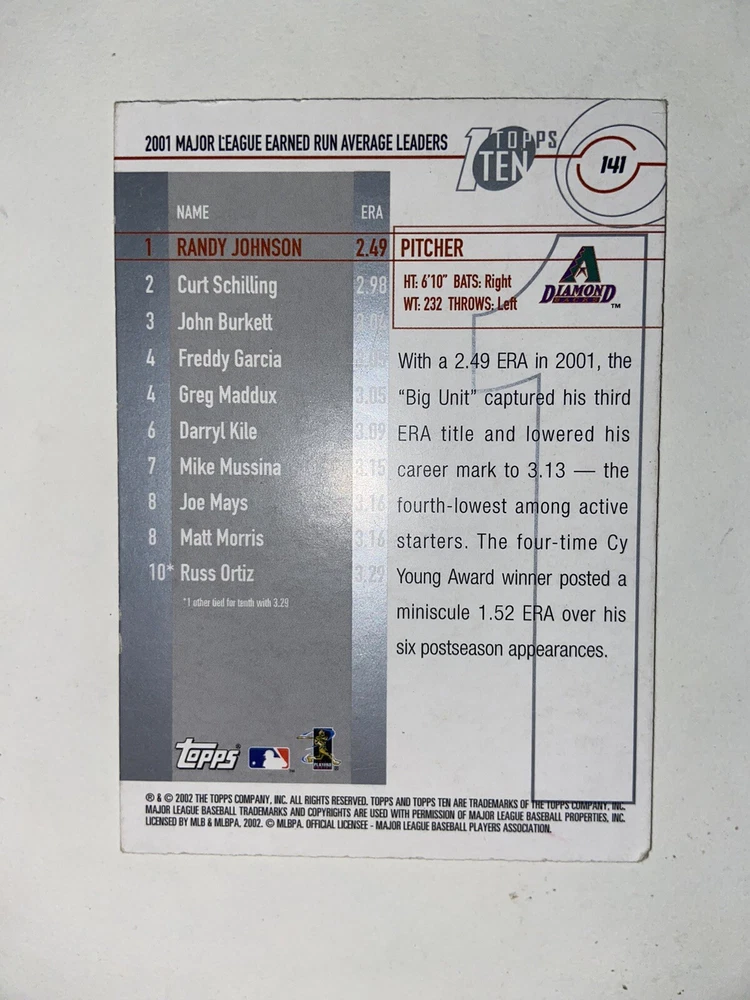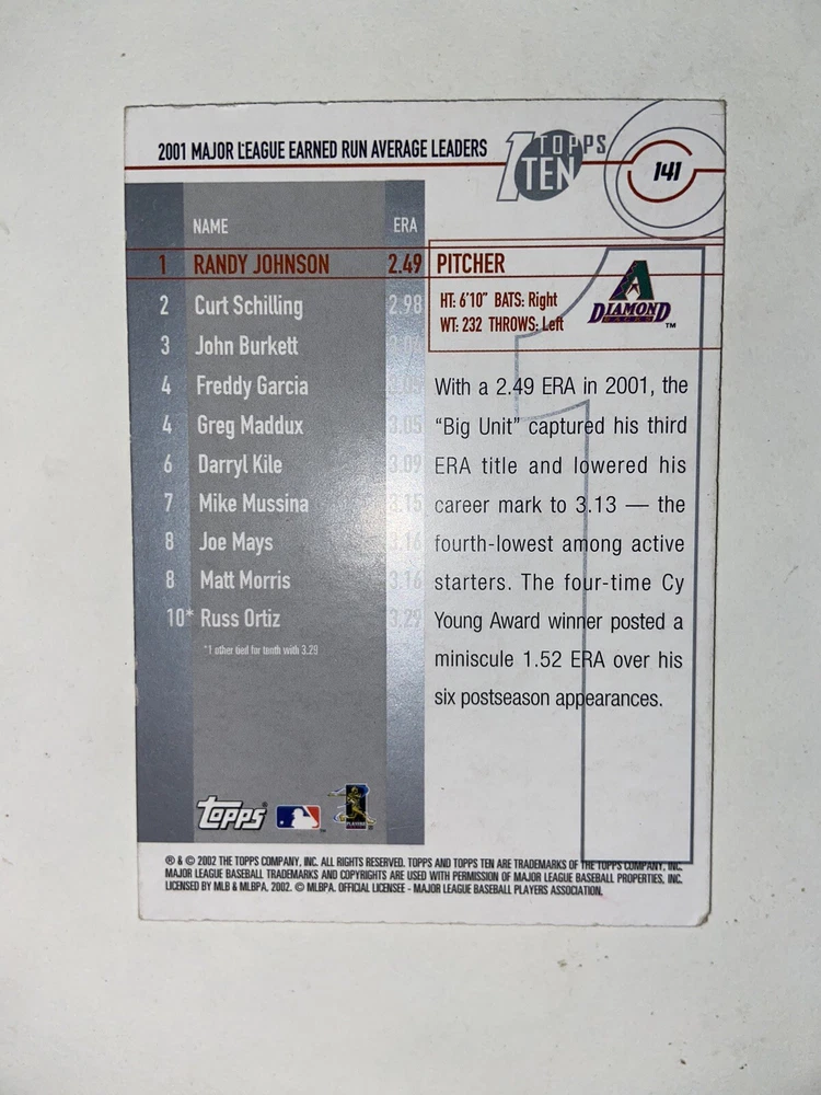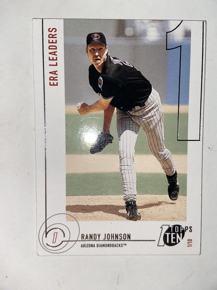 Randy Johnson 2002 Topps Ten Die Cut #141 1/10 ERA Leaders trading card featuring the baseball player Randy Johnson. It is a sports trading card from the 2002 Topps Ten set, manufactured by Topps. The card is a rare die-cut parallel/variety, with a limited edition number of 1 out of 10, highlighting Johnson's performance as an ERA leader in the 2002 season.