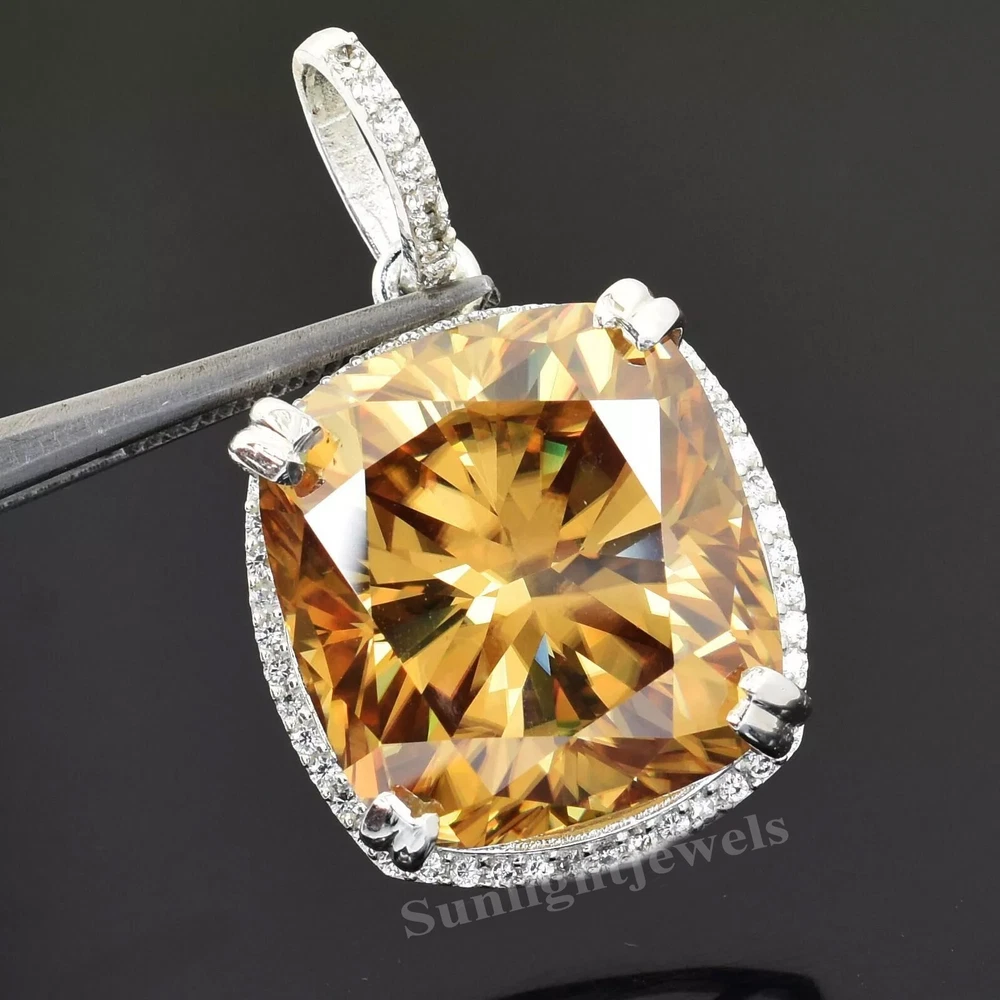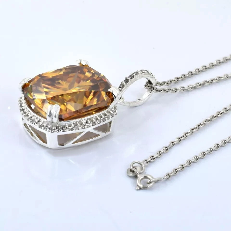 GREAT DESIGN WITH EXCELLENT LUSTER !ONE OF ITS KIND Diamond Color - Champagne Shape of Diamond - Cushion Cut Approx. Weight of Diamond - 16.20 Carat Approx. Size of Diamond - 16 mm x 10 mm Origin of Diamond - Brazil Species - Earth Mined Treated - HPHT Cut - Excellent Clarity - VVs1 Metal - Stamped Solid 925 Sterling Silver Finish -White Gold This diamond Pendant is handcrafted with utmost care. Would make an ideal gift for someone special. The diamond has excellent cut and luster. Comes in attractive packaging. CERTIFICATE OF AUTHENTICITY PROVIDED Shipping : Shipping is by UPS/SPEEDPOST/FEDEX or similar shipping agencies to reach you in 9-12 business days after processing the order. Tracking is provided. Please note: Jewelry items can take up to 10-12 business days to process to take care of ring sizing if any, polishing, finishing, packing and handling, certification, documentation etc. Shipping Charges include eBay fees on Shipping, packaging, certification costs, manpower costs, overheads, taxes etc. in addition to actual courier/postal expenses which have increased substantially as a result of pandemic & global economic conditions. We do not artificially increase the price of the products to include shipping charges but only charge what shipping actually costs us. Combined Shipping: Combined shipping discount is available up to 5 (Five)items in an order to be purchased within 5 days. You can continue to buy- Any additional items above 5 in quantity will be considered a new order. This is to avoid pilferage en-route as well as to ensure that you are happy with the merchandise. Once you have received their items you may buy additional items again. This limit may be revised for repeat and regular customers. Payment: Buyers are requested to pay within 3 (Three) days of purchases. eBay will automatically open unpaid item cases in case payment is not received within this period. The item will also be available for purchase to other buyers till such time that the payment is received. Customs and Taxes: Any customs duties, charges and local taxes are subject to local laws and vary from country to country and hence the payment of any eventual custom duties, charges, levies and taxes etc will be at the buyer's expense. We do not have any control on the same. Returns & Refunds: You can return the item within 14 days of receiving the parcel. - Please return in original packing. Buyers are required to check and ensure that the item/s are in good condition and as per item listing on eBay as no claims for returns and refunds will be entertained thereafter. The returned item should be unused and in original and undamaged condition. Buyer will be required to ensure that the item is sent by trackable shipper. Shipping charges are non-refundable. Refunds are made by PayPal and may take up to 5-7days after receiving back the product/s. Disputes: We aim to settle all disputes amicably. Please do not open any dispute on eBay for dis-satisfaction or for non-receipt or to return an item. We are available through ebay messages system and most messages are replied in a few hours. Personalized satisfaction is of utmost importance to us. Feedback : We always provide excellent feedback to our buyers and expect the same in return with 5-star ratings. In case of any dissatisfaction or any other reason please do contact us before leaving any neutral or negative feedback - we will strive our best to resolve all issues to your satisfaction. Metal : Silver is 925 Sterling Silver with Nickel Free Rhodium Plating. Please refrain from buying if you have allergic reaction to metals. We will not be responsible for any health problems in this regard. Legal Disclaimer : Refund or any claim liability for the buyer is only limited to the value of the item purchased. No additional claims will be entertained for any other reason whatsoever. Please note that since various labs may have different testing methods and the interpretation of all our Diamonds and Stones may differ from one lab to another as well as from one Gemologist, appraiser and Jeweler to another, we will be unable to accept another Lab Certificate or the judgement of any other third party including any Gemologist, appraiser, Lab, Jeweler etc. By consenting to buy our items it is understood that you have read, understood and agree to the terms and conditions as well as the FAQ for the Diamonds and Jewelry being sold buys. FAQ What are Color Diamonds? These are genuine Colored Diamonds found naturally mines mainly from Brazil. They are more porous than White Diamonds and are found in the upper layers of the ground relative to the White Diamonds that are mined deep. Some scientists are of the opinion that their origin maybe a Meteor that impacted earth Billions of years ago. What is their nature? Colored Diamonds are not found in the state as they are sold. They are made from earth mined rough rock found in mines of Brazil. The Rock color varies from Light Blue, Dark Blue, Champagne, Pink, Green etc. What is the treatment process? To bring out its true color it needs to be treated. The process is a natural one employing gentle heating a high-pressure environment (HPHT) which gradually brings out the true color of the Diamond. Are any artificial colors or chemicals added? There are no artificial colors or chemicals included in the process. They are not irradiated. Does it alter the composition? The process may or may not alter the composition. It remains a true Diamond nevertheless. Once our diamonds are heat-treated, it may move the molecules. This causes them to not always test properly with a hand tester. If a hand tester is used, sometimes they test as diamonds and sometimes they test as moissanites. But they are genuine earth mined diamonds, not moissanite or CZ. If you use a jeweler's loop you can see this by their molecular composition. How does it differ from a Moissanite? A Moissanite is man-made whereas our Diamonds are earth-mined. A Moissanite will lose 