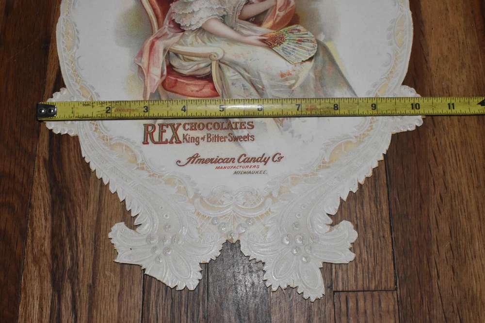 Indulge in the nostalgia of yesteryear with this extraordinary find—a genuine, very rare die-cut paper advertisement for Rex Chocolates, the King of Bittersweets! Crafted by the American Candy Company in the heart of Milwaukee, Wisconsin, this piece is a sweet testament to a bygone era. 🕰️ Time Travel Through Chocolaty Delights: This exquisite advertisement hails from the early years of the American Candy Company, which thrived in Milwaukee from 1902 to 1939. Judging by the elegant dress of the lady in the ad, this gem transports you back to the golden age of chocolate craftsmanship. 🎨 Artistry Beyond Words: Measuring approximately 15 inches in height and 10 1/4 inches at its widest point, this die-cut masterpiece showcases the artistic prowess of the time. The attention to detail, vibrant colors, and intricate design make it a true testament to the dedication that went into creating confectionery delights. 👑 Rex Chocolates - The King of Bittersweets: As the crown jewel of this piece, Rex Chocolates proudly takes center stage. The King of Bittersweets title is not just a claim; it's a promise of unparalleled taste and quality. This advertisement is a window into an era where every chocolate had a story, and Rex Chocolates told a tale of decadence and delight. 📜 Provenance and Rarity: With the American Candy Company's legacy etched into this artifact, you're not just acquiring a rare advertisement; you're taking ownership of a slice of American candy history. The scarcity of such well-preserved die-cut pieces adds an extra layer of exclusivity. 🔍 Condition: This vintage piece is in remarkable condition, considering its age. The colors remain vivid, and the details are sharp. A testament to the quality of craftsmanship and the care taken by those who cherished it throughout the years. 🎁 Perfect for Collectors and Enthusiasts: Whether you're an avid collector of vintage advertisements, a chocolate connoisseur, or someone who appreciates the charm of days gone by, this Rex Chocolates die-cut is a must-have addition to your collection. 🌟 Don't Miss Your Chance: Opportunities to own a piece of sweet history are rare, much like the chocolates it represents. Bid now and bring home this enchanting die-cut Rex Chocolates advertisement—a sweet journey back in time! p4