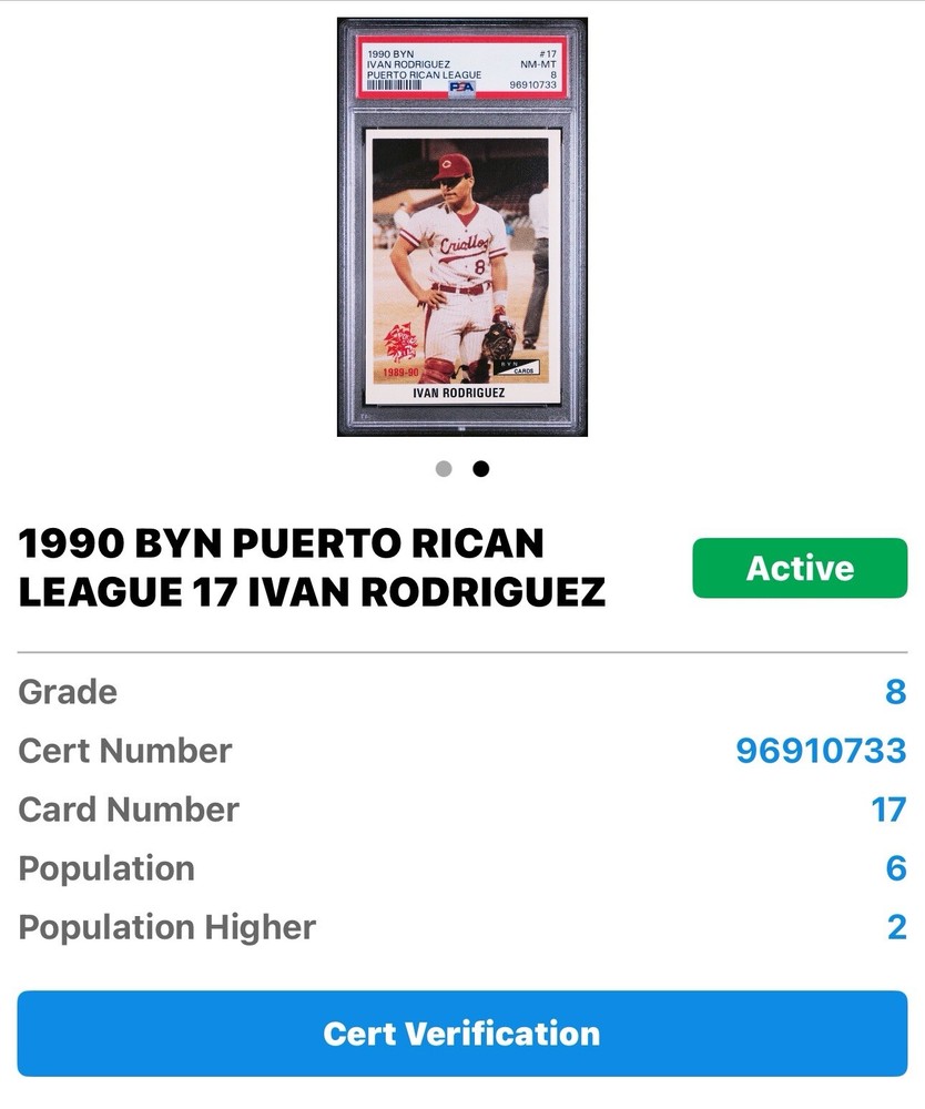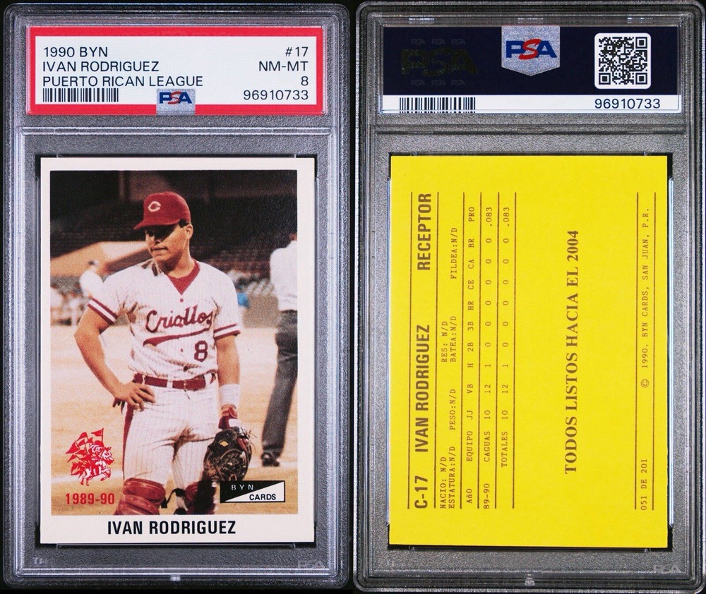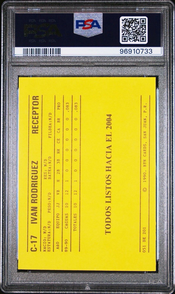 This 1990 BYN Ivan Rodriguez Puerto Rican League C-17 trading card is a must-have for any baseball fan. With features like Minor League and BYN Parallel/Variety, this card is a unique addition to any collection. The card is a part of the 1990 BYN Set and is numbered C-17 with a total population of only 6. The card showcases Ivan Rodriguez, who played for the Puerto Rican League with the Criollos de Caguas teams during the 1990 season. This sports trading card is perfect for anyone who wants to own a piece of baseball history. Get your hands on this rare card today! ---------------------------------------- 20242512 POP 6 POP HGH 2 ---------------------------------------- Iván Rodríguez Torres (born November 27, 1971), nicknamed "Pudge" and "I-Rod", is a Puerto Rican former Major League Baseball catcher. A member of the National Baseball Hall of Fame and Museum, Rodríguez is widely regarded as one of the greatest catchers in MLB history. He played for the Texas Rangers (in two separate stints, comprising the majority of his career), Florida Marlins, Detroit Tigers, New York Yankees, Houston Astros and Washington Nationals. Rodríguez was awarded the AL MVP award in 1999. He won the 2003 World Series with the Florida Marlins and played in the 2006 World Series while with the Tigers. In 2009, he set an MLB record by catching his 2,227th game, passing Carlton Fisk. He had the best career caught-stealing percentage of any major league catcher, at 45.68% (versus a league average of 31%), and he had nine seasons with a caught-stealing rate of 50% or higher.[3] Only one major league catcher (Yadier Molina) has more putouts. In 2017, Rodríguez was elected to the National Baseball Hall of Fame and Museum in Cooperstown in his first year of eligibility, receiving 76% of the votes cast.