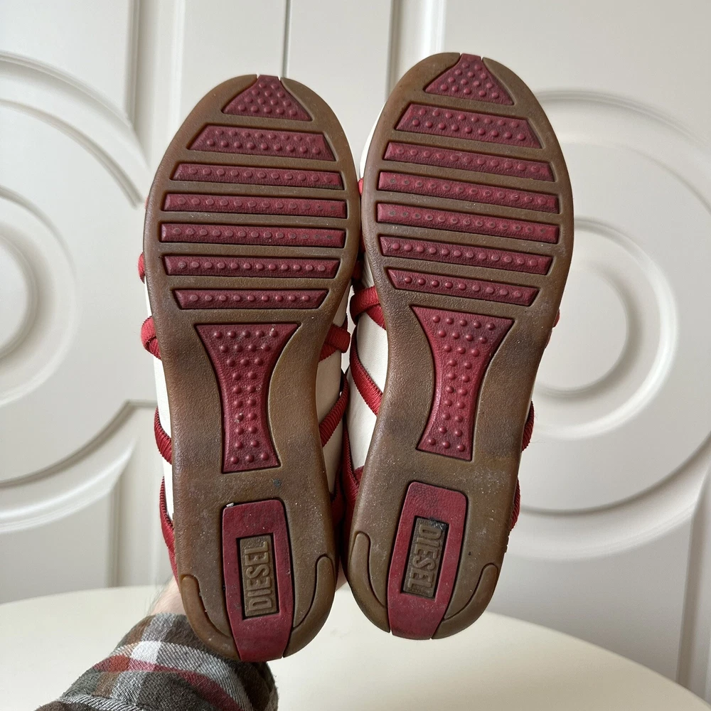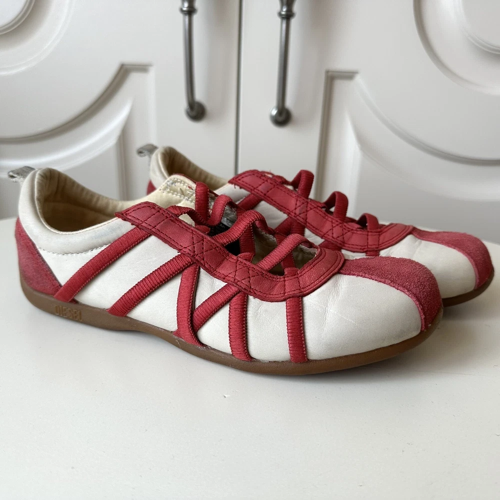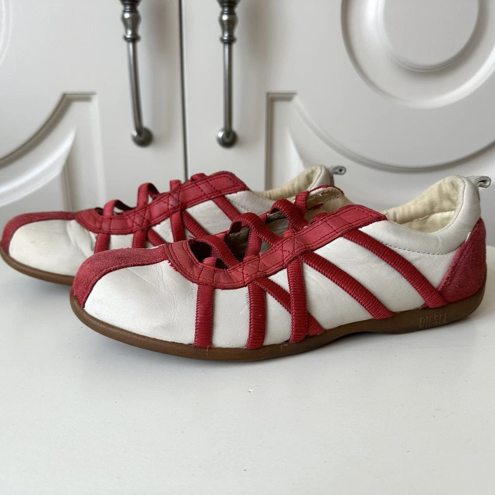 Size 7us - 2000s DIESEL ‘Valencia’ lace ballet flats. Incredible condition with little signs of use. Finished in white leather with red accents and a gum outsole. Features a really unique ope-front lace design. No box.