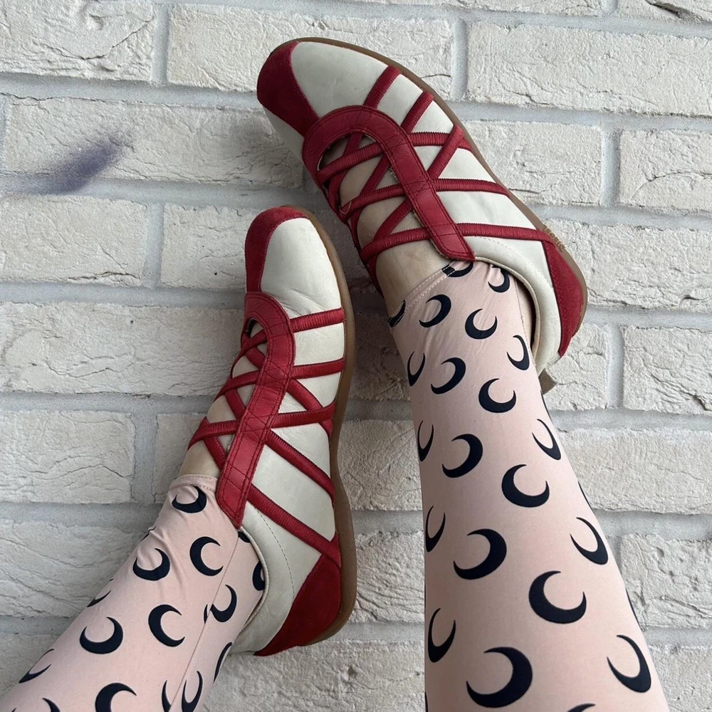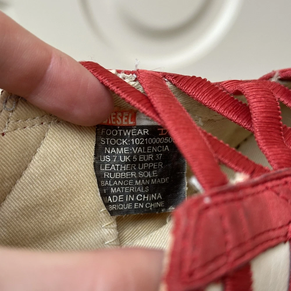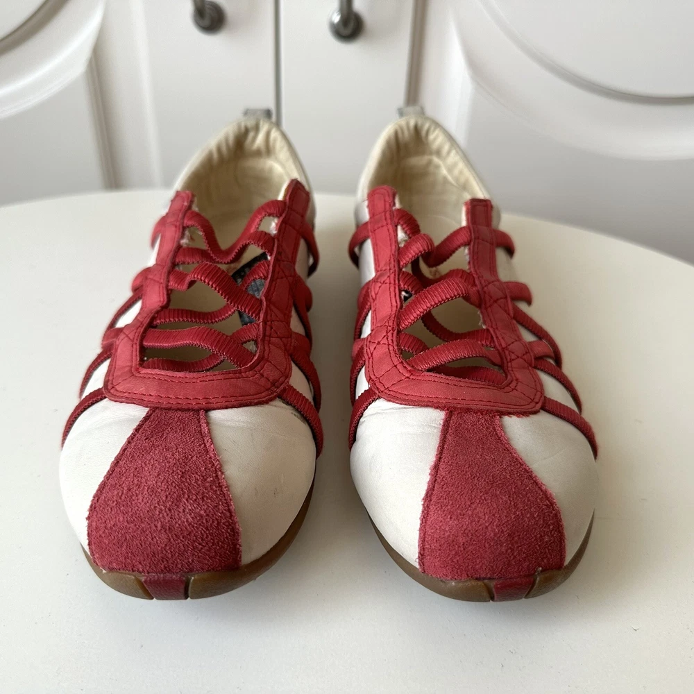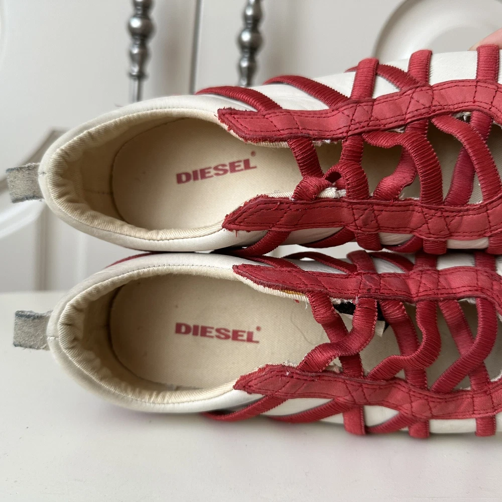 Size 7us - 2000s DIESEL ‘Valencia’ lace ballet flats. Incredible condition with little signs of use. Finished in white leather with red accents and a gum outsole. Features a really unique ope-front lace design. No box.