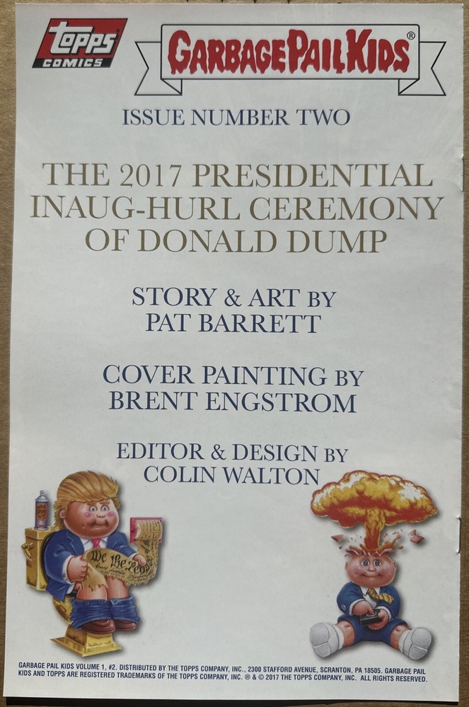 The *RARE* 2017 Garbage Pail Kids Donald Dump Trump Presidential Ceremony Comic Book features the character Donald Trump in a satirical and humorous light within the realm of US Comics tradition. This collectible comic book is likely a parody of the presidential inauguration ceremony of Trump, as indicated by the title. With its unique and limited edition of ONLY 455 printed, this comic book would be a sought-after item for fans of Garbage Pail Kids, collectors of comic books and memorabilia, as well as those interested in political humor and satire.
