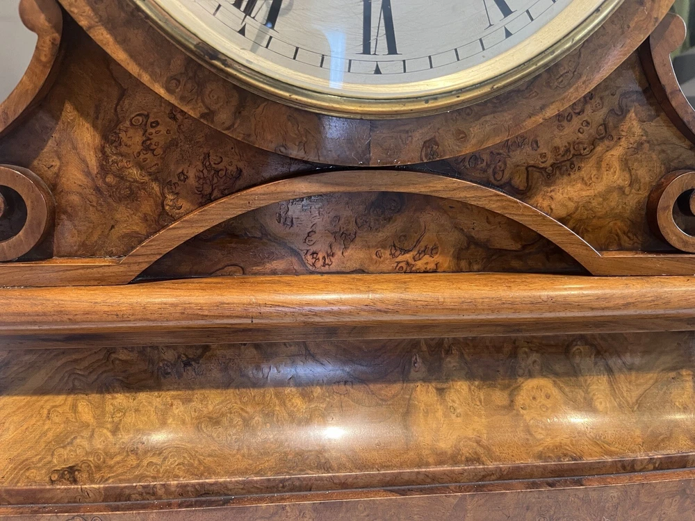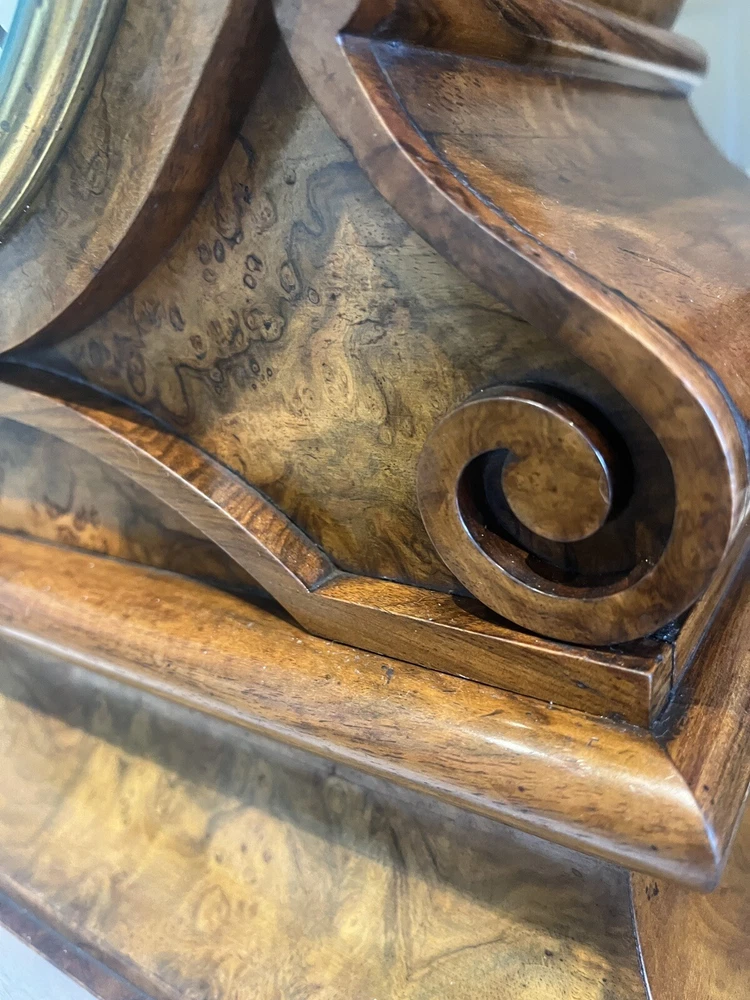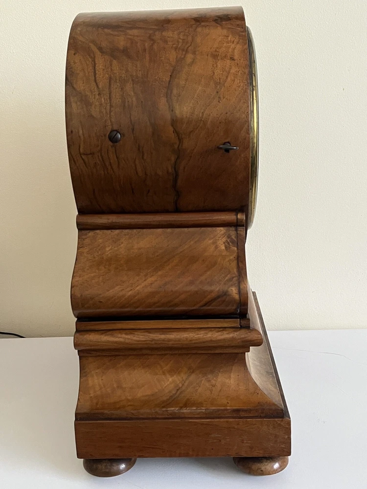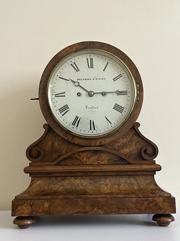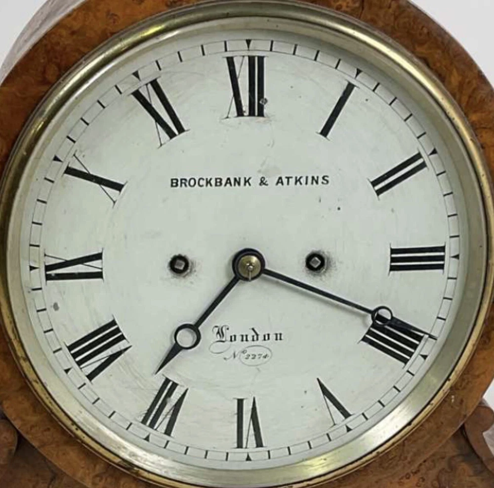 Lovely walnut striking fusee mantle clock c1840 by Brockbanks & Atkins numbered 2274 on the dial and also on the back plate of movement. The firm of Brockbank & Atkins was established when Cumbrian-born brothers John (1747 – 1806) and Miles (1754 – 1821) Brockbank, who trained as watchmakers in London and gained a reputation as preeminent manufacturers of marine chronometers, eventually went into partnership with clock and watchmaker, George Atkins (1767 – 1855). Subsequent generations of their families joined the business and together they were considered the most distinguished chronometer makers of late 18th and 19th Century London. Feel free ti ask any questions before bidding. This antique clock is a true gem for collectors. With its classic design and intricate details, it is sure to add a touch of elegance to any room. The clock has been carefully crafted making it a wonderful addition to any antique collection. The clock is perfect for those who appreciate the beauty of antiques and want to add a touch of history to their home. Its unique design and quality construction make it a valuable piece that is sure to impress. Don't miss out on the opportunity to own this stunning antique clock.