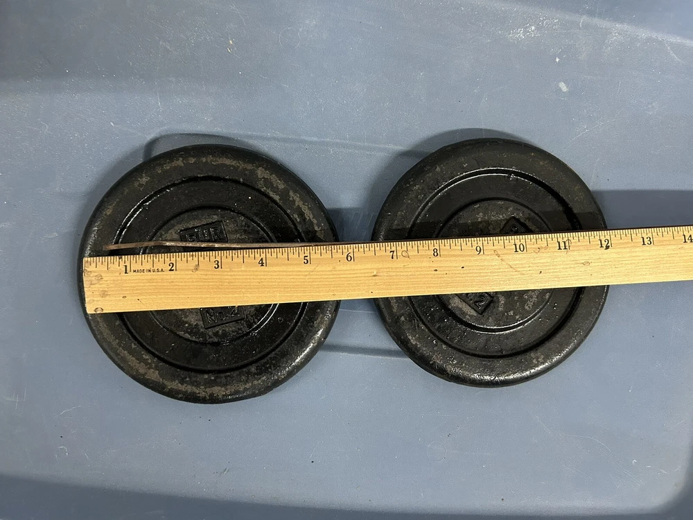 This vintage set of weight plates from Bur is a rare find for any weightlifter or collector. The 5 lb plates are made of durable iron and come in a classic black color, making them a versatile addition to any home gym. These standard weights are perfect for both men and women and were made in the United States, adding to their unique history. The plates are in excellent shape and are a great addition to any strength training collection. Whether you're a seasoned weightlifter or just starting out, these plates are sure to impress. Don't miss out on the opportunity to own a piece of fitness history with this vintage Bur weight plate set.