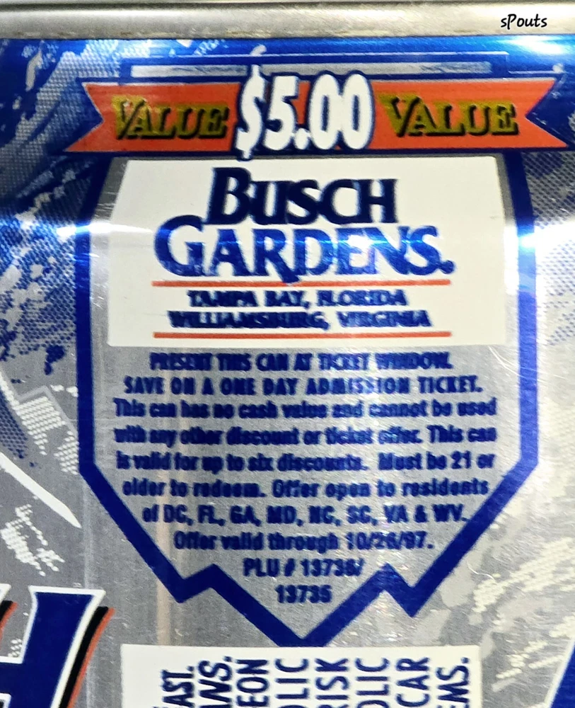 Pictures show different views of the ONE EMPTY CAN in this listing sale Texas Motor Speedway ... A NAS CAR Tradition BUSCH GARDENS COUPON! VARIATION $5 OFF 1997 AMUSEMENT PARK VALUE DISCOUNT TICKET VARIATION FAIR ..Tampa, Florida - Williamsburg, Virginia 1997 TEXAS MOTOR SPEEDWAY BUSCH LIGHT BEER CAN NASCAR STOCK CAR TRACK FORT WORTH Fort Worth, Tx. NAS CAR National Association for Stock Car Auto Racing _ BUSCH _ _ LIGHT _ Anheuser-Busch # 663750 LIMITED EDITION HIGHLY COLLECTIBLE NASCAR SPORTS CAR RACING INTERNATIONAL, SPEEDWAY, RACE TRACK, COLLECTIBLE SERIES DATED MAY 22, 1997 Features Track map, logo, and fun facts, etc. Brewed and Canned by Anheuser-Busch Inc . , St. Louis, Mo. ONE EMPTY, Beautiful all aluminum 12oz lift-push-pull stay-tab top tin beer can 1990's EMPTY & All Original, bottom opened - tab intact, Great condition BUT has a few minor dings, some minor small scuffs, no holes except opener holes, Best face displays great to excellent P l e a s e, D o n o t a s s u m e .. A s k u s a n y t h i n g ! 'sPouts' offers discounted combined shipping on all items won or purchased PLEASE let us know to hold. PLEASE ask for a 'total' WHEN READY TO PAY When you pay, we ship the next business day U. S. A. Addresses - Pay a S/H charge for one item DISCOUNTS (COMBINED) shipping ON YOUR OTHER ITEMS WHEN SHIPPED IN THE SAME BOX NON - U.S.A. INTERNATIONAL BUYERS - Please contact us for a shipping/handling quote. BEFORE BIDDIN G All of OUR items are individually wrapped and carefully packed for shipping Thanks! and.. PLEASE STAY TUNED! * * * * * sPouts * * * * * ALL BEER CANS & BEER BOTTLES ARE EMPTY