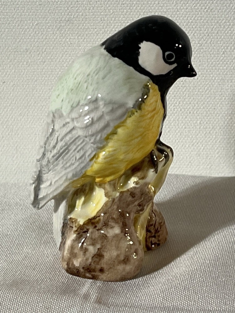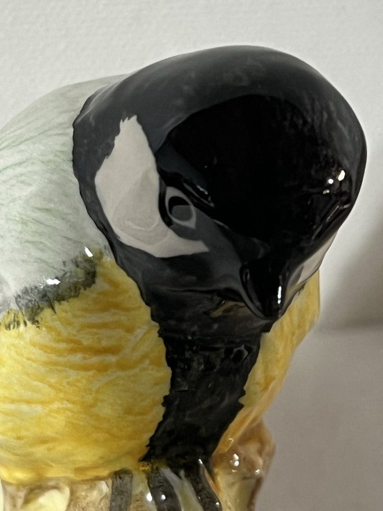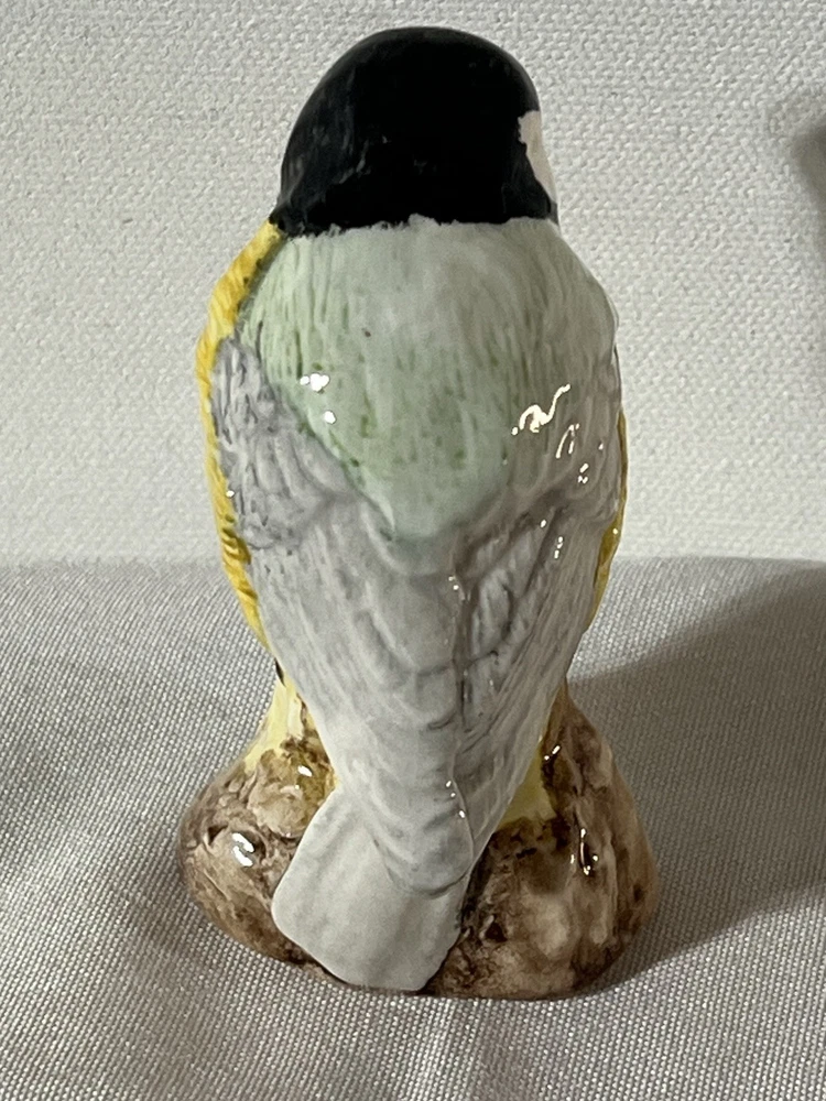 The Beswick, England Great Tit Bird Figurine 3274 is a vintage collectible piece made of porcelain and quite rare! Hand-painted with a glossy finish, this art pottery figurine features a multicolor design of an all-over bird pattern. Martyn Alcock is the designer. Colors include black, yellow, white and gray in a gloss finish. Produced in Great Britain in or around 1992, this Beswick figurine is a charming addition to any decor, especially for those who appreciate bird-themed pieces from the late 20th century. The Great Tit is in excellent condition with no cracks, chips or restoration. Few pieces for sale exist, mostly in England. Price is less than fair market value with free shipping!