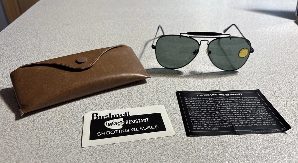 RARE Bushnell Vintage Sunglasses Pilot/Aviator Black Korea Shooting Glasses Bought and never used. Includes case, limited lifetime warranty information, and glasses with original sticker still on it.
