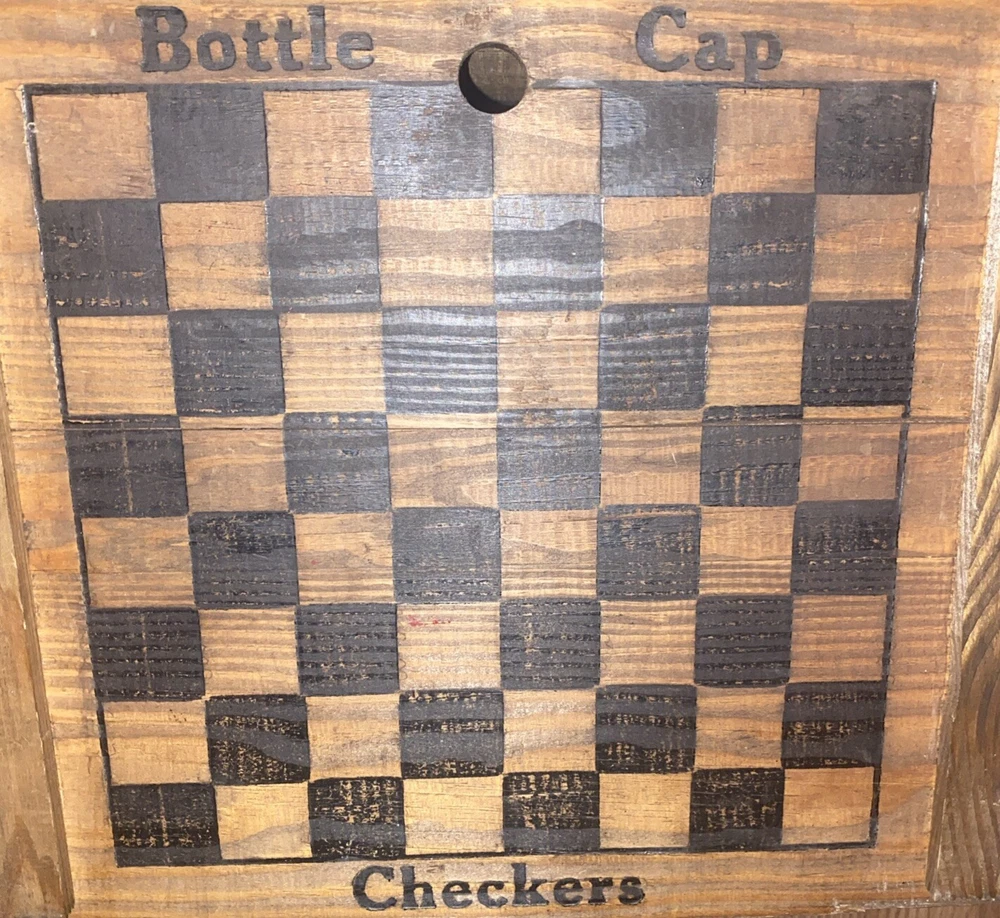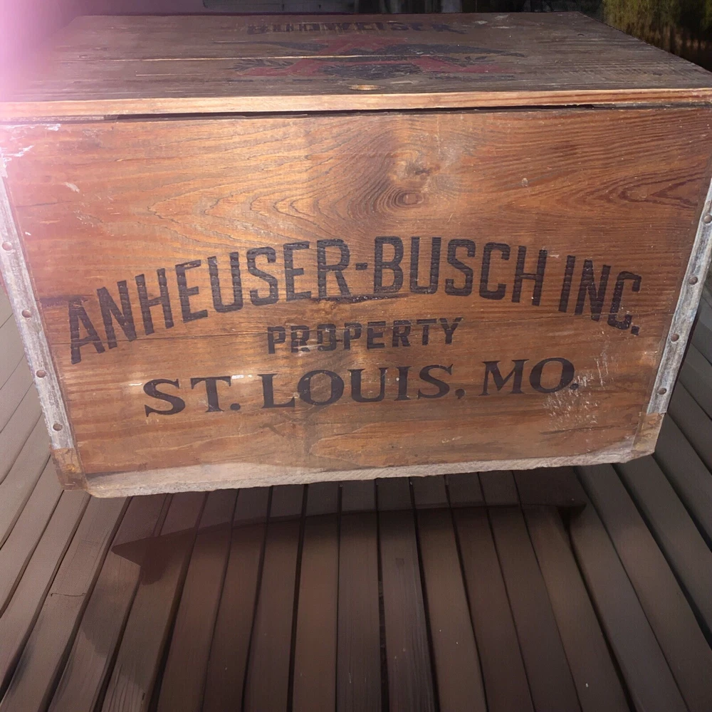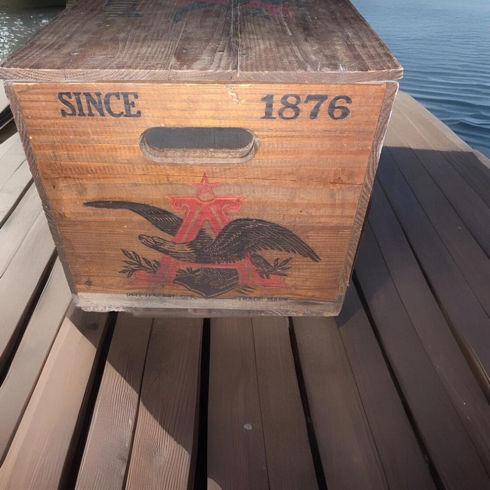 RARE very hard to cross paths with one of these crates that has the beer top checkers board on the underside of the crate Lid don’t miss this opportunity! There’s tons of these crates online for sale but this is the only one like such for sale online at this time I can locate and I have only personally seen one other crate myself with this game underside lid !! Crafted for enthusiasts of Americana and Breweriana, this Vintage Budweiser Wooden Crate Box celebrates the Centennial of Anheuser-Busch's storied brewery since 1876. The piece hails from the United States and bears the classic insignia of the iconic Budweiser brand, making it a must-have for collectors and fans of the storied brewery. The crate's robust build and historic significance offer a glimpse into the rich tapestry of American brewing heritage. It stands as a testament to the enduring legacy of one of the most recognized names in beer, and its presence in any collection is sure to be a conversation starter. Whether displayed as is or repurposed, this sign is a genuine piece of brewing history.