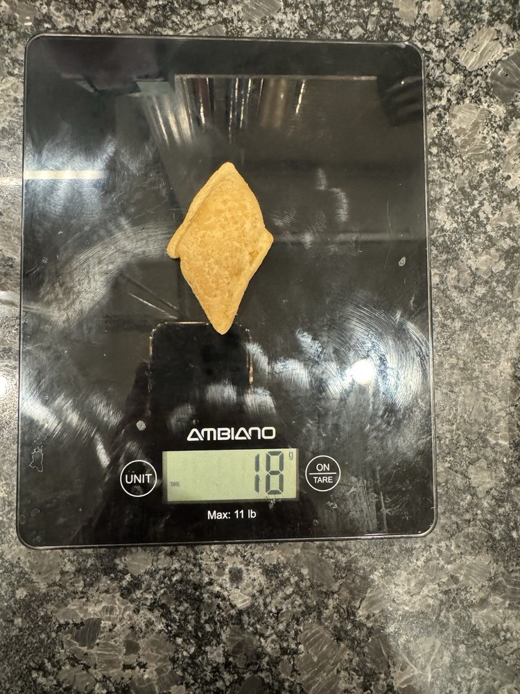 This is a rare and unique diamond-shaped Totino's Pizza Roll in Triple Cheese flavor, weighing in at 18g. I’ve eaten THOUSANDS of pizza rolls over my years and never before seen a roll of this shape or anything close to it. NOT SMUSHED. The roll is 100% sealed and innards are intact. Pizza Roll has been microwaved once but is now air sealed and frozen for preservation purposes. I can ship in a sealed cold insulated container