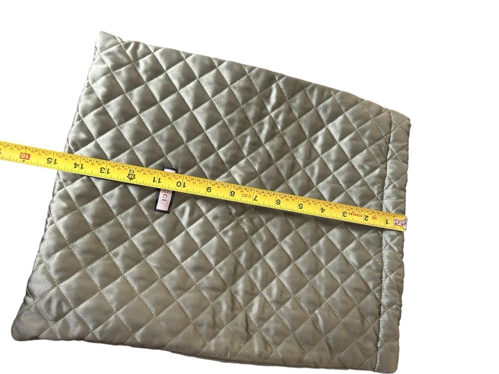 1. This rare Gucci silk gift box and quilted drawstring bag is a stunning collector's piece! The emerald green satin and brocade detailing give it a luxurious feel, perfect for storing special accessories or displaying as decor. Though pre-owned with minor wear, the craftsmanship still shines—just one loose thread and light smudges. Spacious enough for small handbags or keepsakes, it’s a unique find for any Gucci enthusiast. Photos accurately show condition, and the seller is responsive. A fabulous vintage treasure!