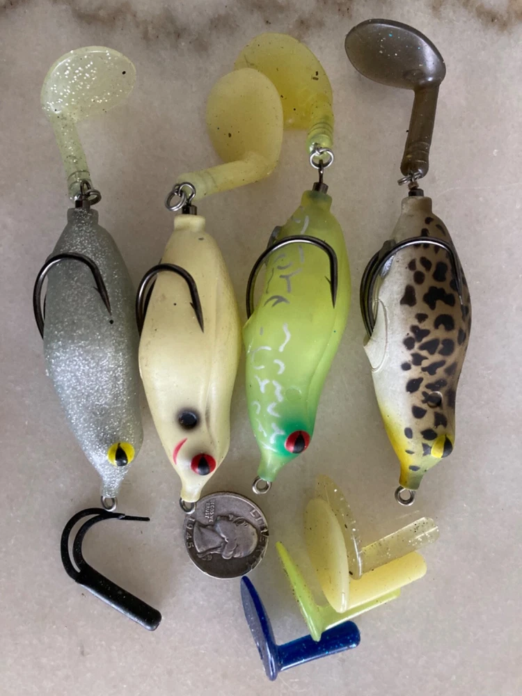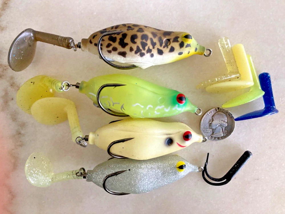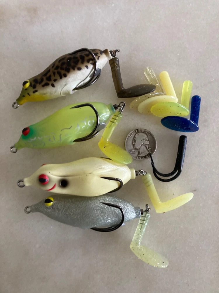 HOOKED-ON-VINTAGE IS SO PLEASED TO OFFER TOPWATER FROGS, RARE LOT 4 OF TECKLE TACKEL PADDLE TAIL FROG TOPWATER FISHING LURES CRANKBAIT FROGS WITH EXTRA PADDLE TAILS LEOPARD FROG SPOT. VTG LOT 4 WEEDLESS WEEDLESS LURES FROG SPOT TOPWATER SOFT FLOATER. SO SORRY THE U.S. QUARTER IS NOT INCLUDED WITH THESE LURES, IT IS MERELY TO SHOW SIZE / SCALE OF THE BAITS IN THE SUPER-SIZED PHOTOS. THIS LISTING IS FOR A NEW LOT OF 4 FROG FISHING LURES AS SHOWN IN THE PHOTOS, SOLD AS SHOWN IN THE SUPER-SIZE PHOTOS. I HAVE OTHER GREAT VINTAGE FISHING GEAR FOR SALE ON EBAY CURRENTLY, AND WE LOVE TO COMBINED THE SHIPPING TO SAVE YOU MONEY AND ALLOW YOU TO GET ALL THAT YOU WANT FOR YOUR COLLECTIONS, OR FOR GIFT GIVING. SOLD AS IS, AND AS SHOWN IN THE SUPER-SIZED PHOTOS. Please email us with any questions! Thank you for looking!