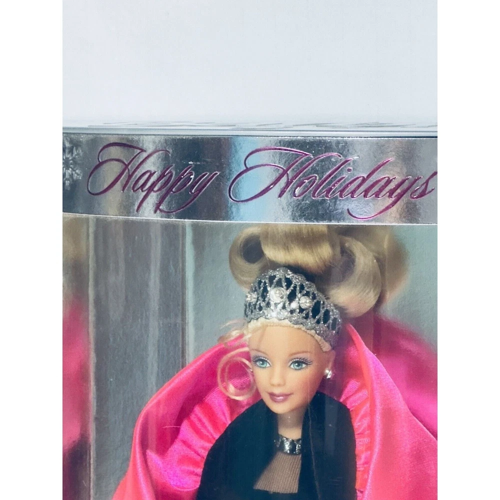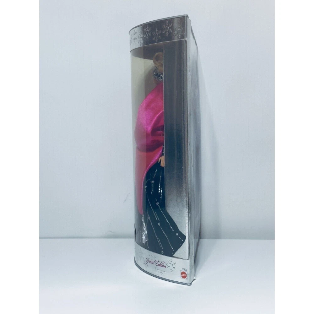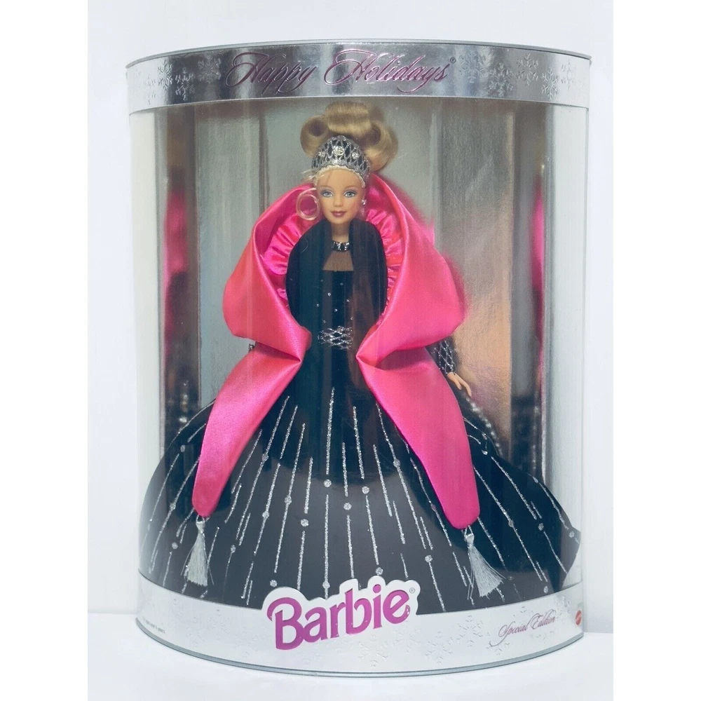 Barbie Special Edition. -RARE- Happy Holidays Barbie, Special Edition from 1998. This specific collectible Barbie is rare because of an error on the back of the box. The doll itself has a long shawl, while on the back of the box she’s wearing a short cloak/hood. She is also wearing a belt on the front, and this belt is missing on the back image. Vintage 1998 Happy Holiday Barbie 11th in Series Special Edition # 20200 Mattel Black Velvet Dress Great Gift Barbie Collectors Black Velvet Dress, Silver Accents, Blonde Hair, Pink Satin Stole, Gemstones Shop for Christmas early! This is the very rare new in box Happy Holiday Barbie collectors treasure find. Barbie is ready for a night on the town and is wearing an elegant long black velvet black holiday gown trimmed w/shiny silver strands w/gemstones. This is a great edition to your Happy Holiday Barbie collection. She is the only Barbie in the series who is wearing black. She has a beautiful black & silver choker also bright pink satin stole w/silver tassels that complete her great look. Great Christmas gift for your little girl. Barbie's beautiful long blond hair is styled in curls with an up do for a formal evening accented w/ a wide black & silver headband and & crown fit for a princess or queen. Barbie is wearing classic jewels including a stunning pearl ring, pearl stud earrings, and a silver belt. The back of box says: Happy Holidays Barbie Doll A Velvety silhouette In a crystalline dream Barbie makes the Holiday sparkle & gleam.