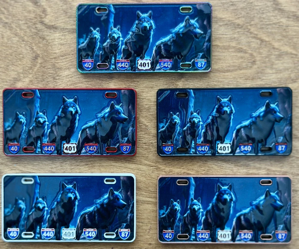 North Carolina State Investigator Gang Unit License Plate Set. All have same serial number. Only 20 of these sets were made. Red Dye (3/120), Black Dye (3/20), White Dye (3/20), Copper (3/20) , and Oil slick (3/20).