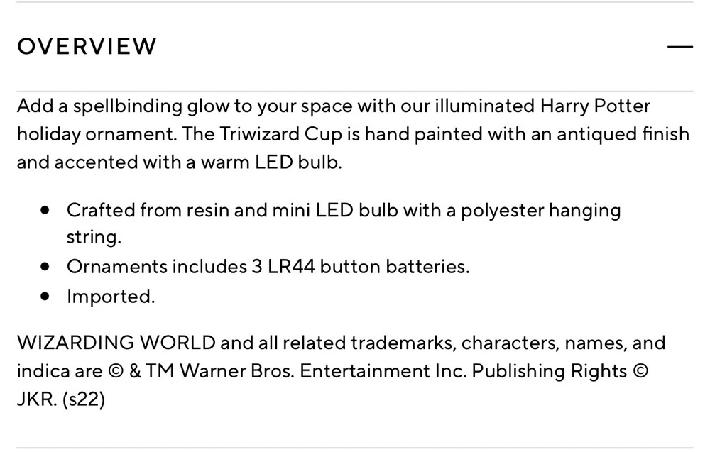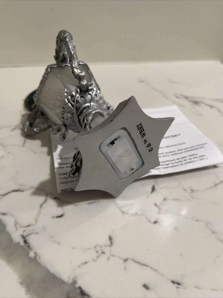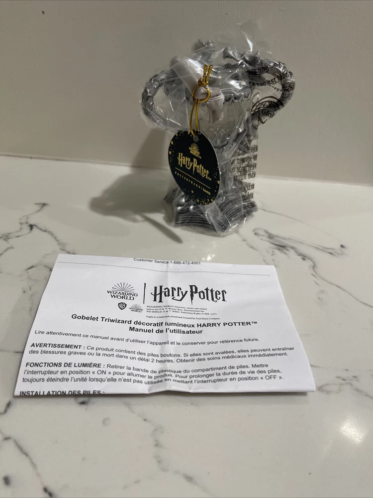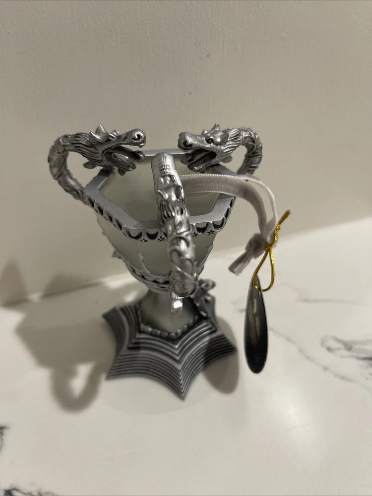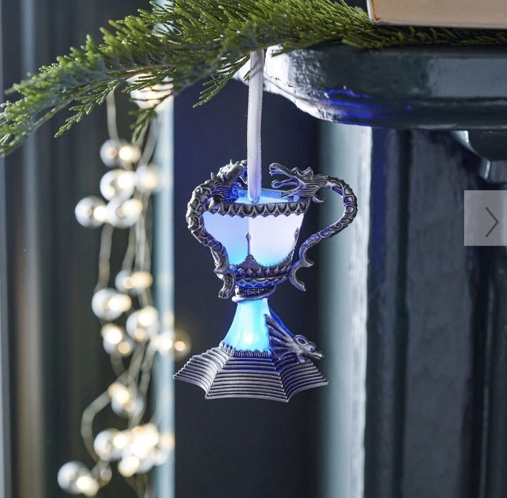 The product is a Harry Potter Triwizard Cup Light-Up Ornament by Pottery Barn Teen. This ornament features a design inspired by the Triwizard Cup from the Harry Potter series and has the ability to light up, adding a magical touch to holiday decorations. The ornament is new in box, making it a perfect addition for Harry Potter fans looking to incorporate their love for the series into their holiday decor. *BRAND NEW IN BOX. Never used and batteries are still new inside ornament. Comes in original PB box.