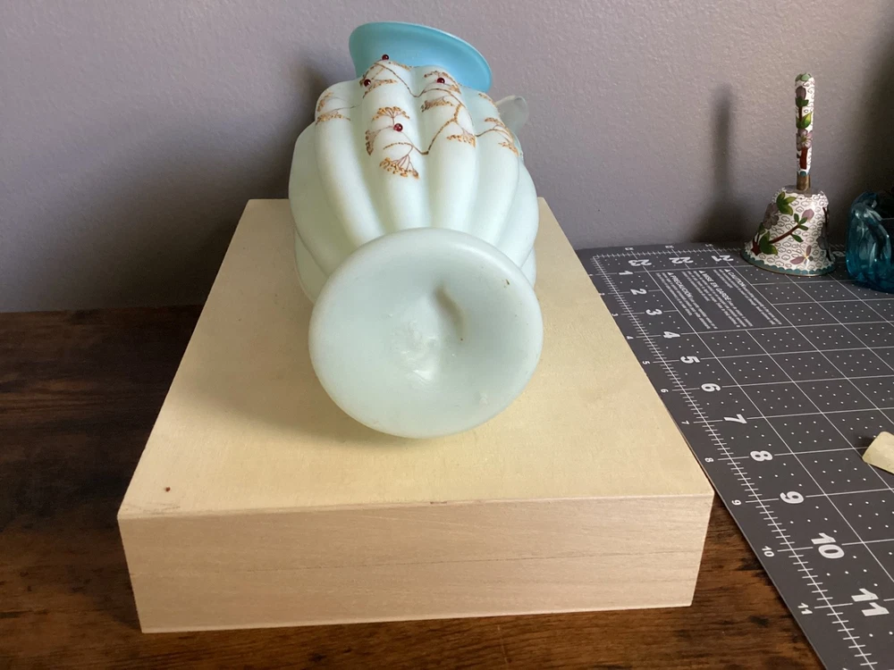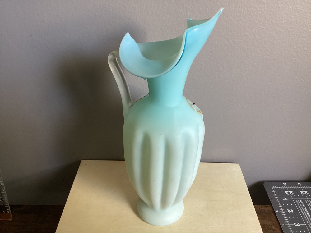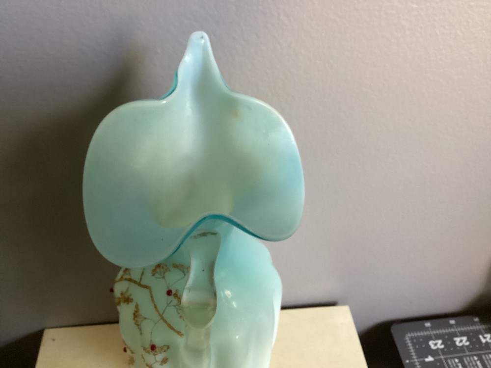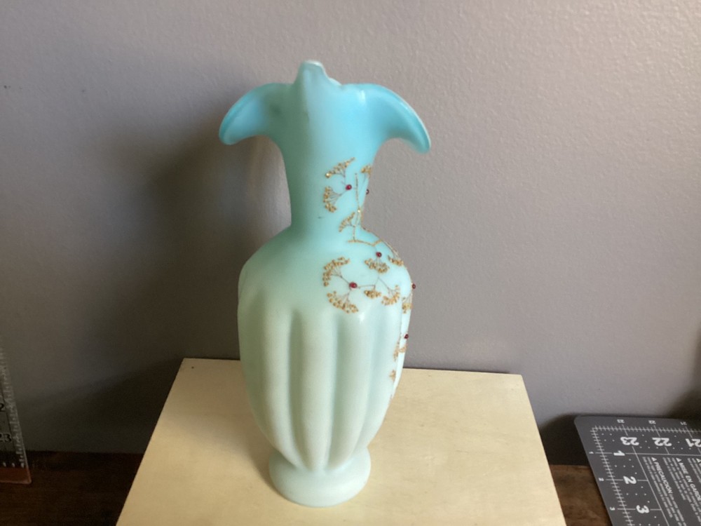 Item Width: 4" Time Period Manufactured: 1900-1919 Item Weight: 2 lb Features: Hand Painted Finish: Satin-Finished Item Height: 11" Glassmaking Technique: Hand Blown Care Instructions: Clean with Damp Cloth Color: Blue Style: Victorian Material: Glass Handmade: Yes Type: Vase Brand: H & H