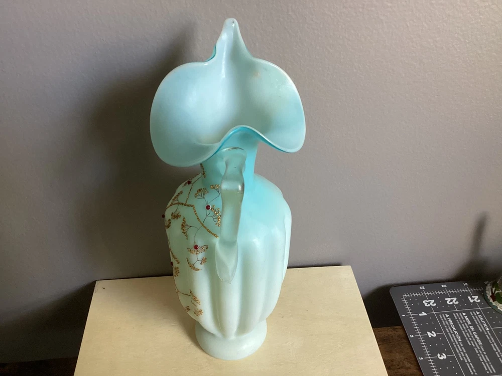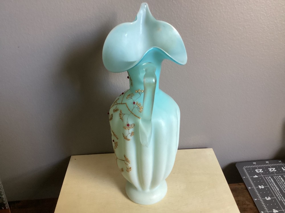 RARE VICTORIAN HAND BLOWN & PAINTED EWER RAISED GILDING RED GLASS BEADING 11”H
