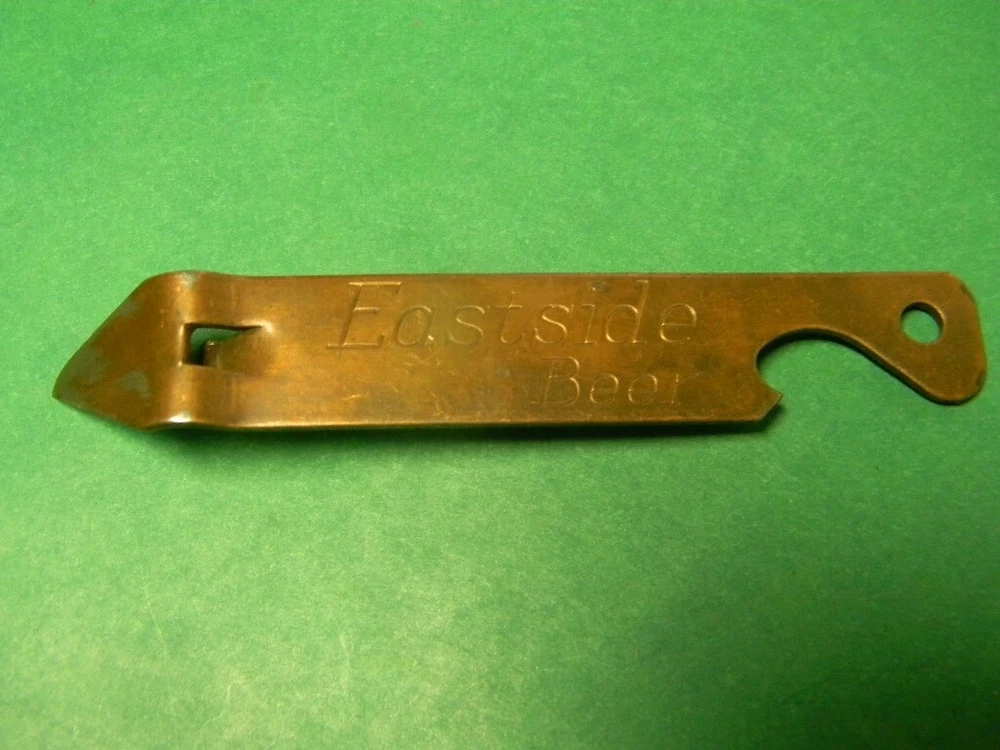 This vintage Eastside beer copper coated bottle and can opener is a rare find for any beer enthusiast. The Brewery from Los Angeles, California, this opener is a unique piece of breweriana that is perfect for adding to any collection. The opener is designed for both bottles and cans, making it a versatile tool for opening all types of beverages. With its sleek design and durable construction, this opener is sure to impress. The Eastside brand is known for its quality products, and this opener is no exception. Whether you're a collector or just looking for a cool piece to add to your bar, this vintage opener is sure to impress.