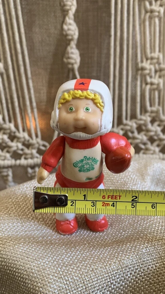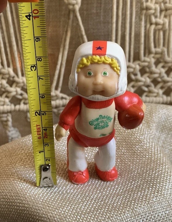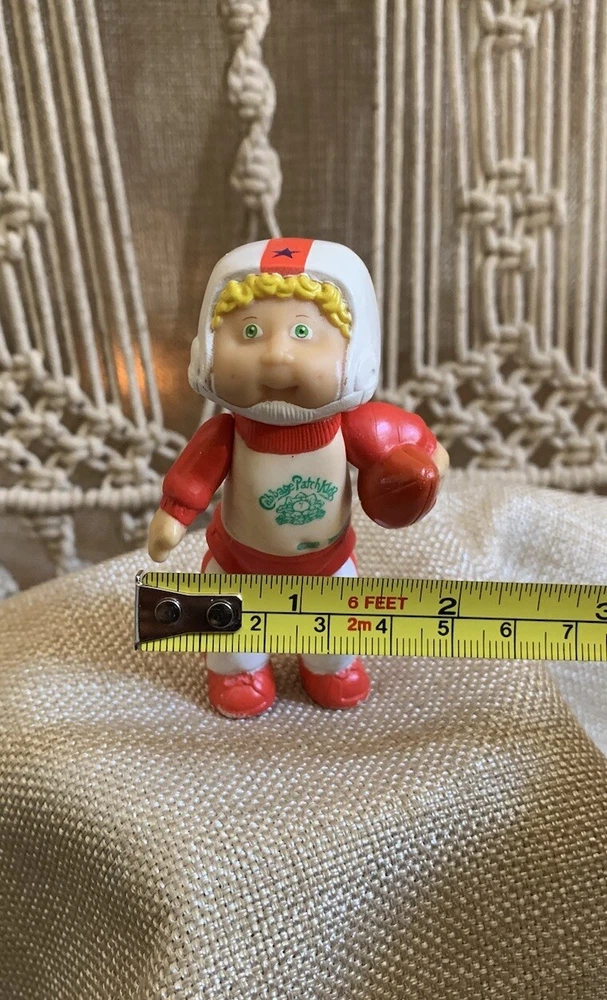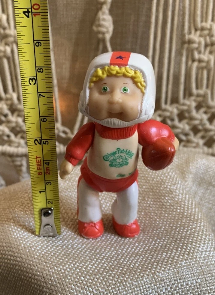 This is a rare vintage Cabbage Patch posable figurine featuring a blonde boy with curly hair and green eyes. The doll is approximately 3.5 inches in size and made of plastic or PVC materials. It is an original, licensed reproduction from the Cabbage Patch Dolls franchise and was manufactured in 1984. The doll comes without packaging and is a single unit. It is perfect for all occasions and would make a great addition to any doll collection.