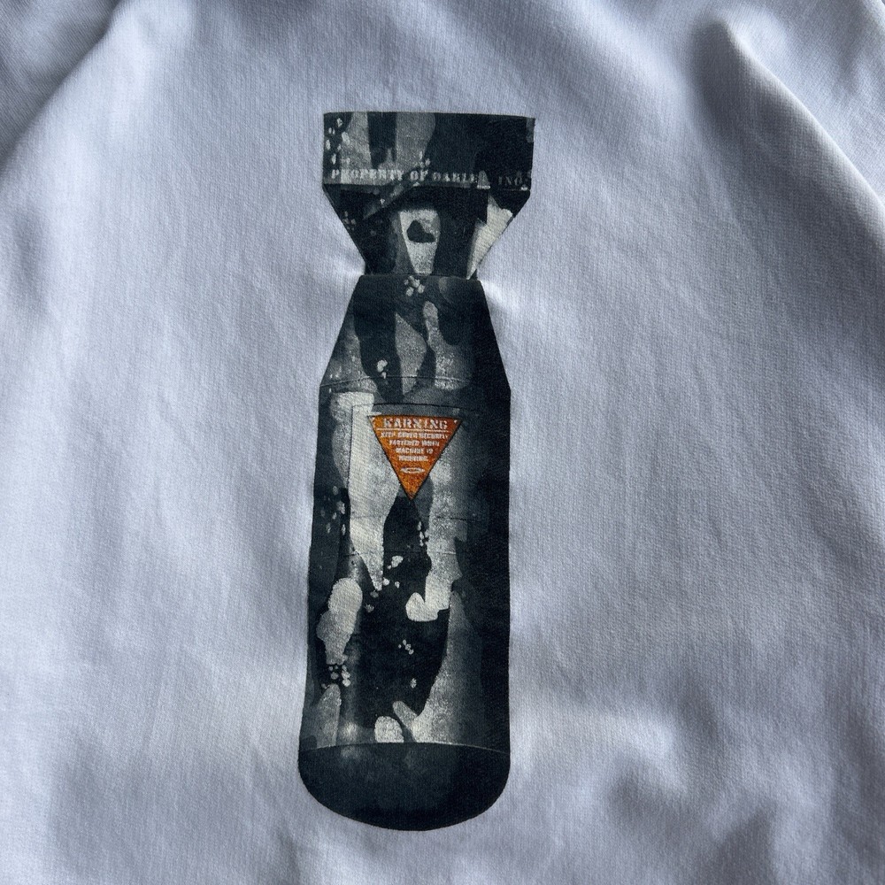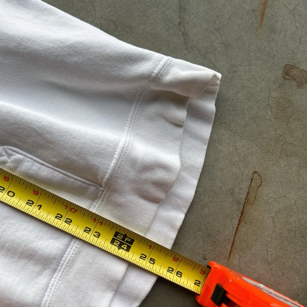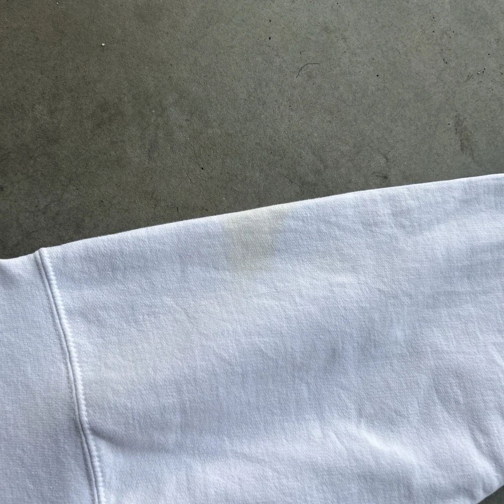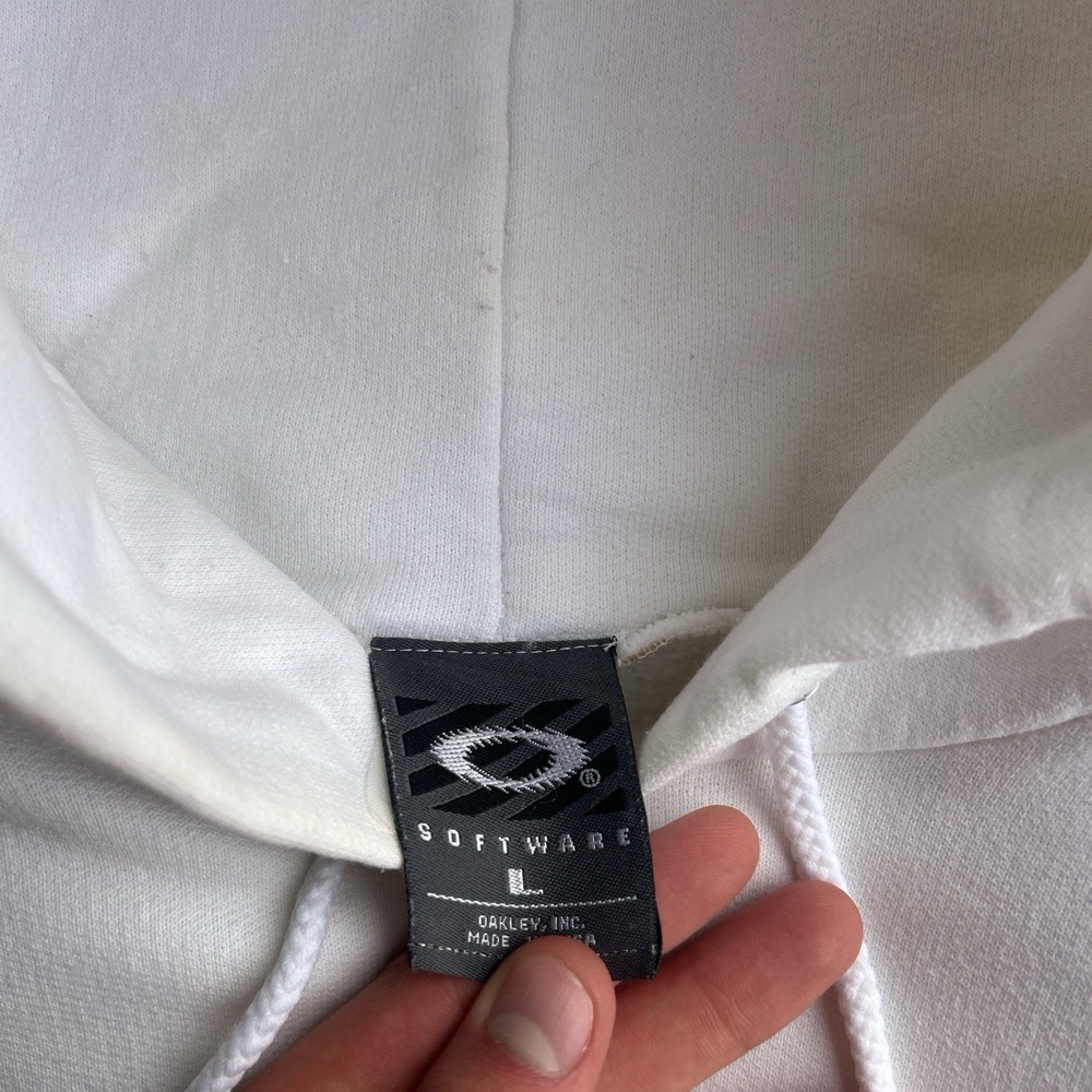 The product is a rare vintage Oakley Software Saw Blade hoodie in size large. This white pullover hoodie features a graphic print with a drawstring closure, making it a stylish and unique addition to any man's wardrobe. With themes ranging from army to sports, this heavyweight hoodie is perfect for all seasons and offers plenty of pockets for convenience. Perfect for those who appreciate retro and 90s style with a touch of steampunk flair. Slight yellow stains throughout