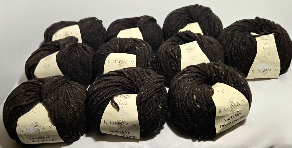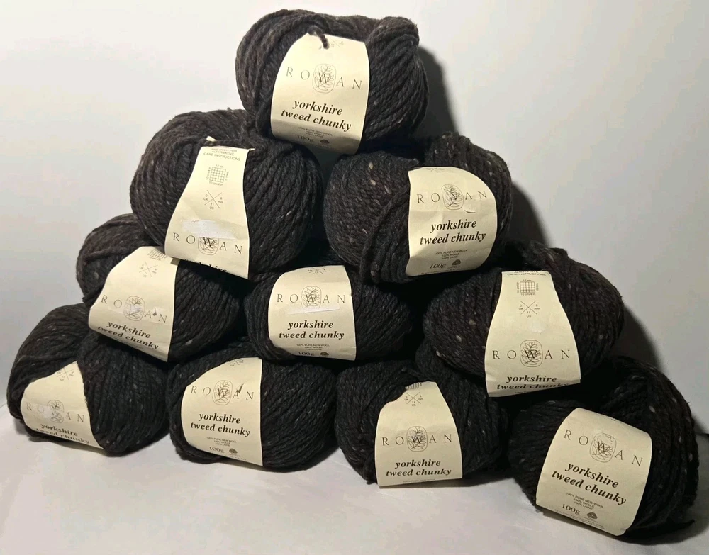 RARE & Discontinued: Vintage Rowan Yorkshire Tweed Chunky Yarn - Colour 554 Stout (Dark Brown) This is a listing for a lot of ten (10) new, highly sought-after skeins of Rowan Yorkshire Tweed Chunky yarn. This rustic, classic yarn is made from 100% Pure New Wool and features the characteristic colorful tweed flecks. It is a discontinued product line, making this bulk lot a valuable find for knitters and collectors. YARN DETAILS: ▪︎Brand: Rowan ▪︎Line Name: Yorkshire Tweed Chunky ▪︎Dye Lot: 6C3 (All 10 skeins are from the same dye lot to ensure consistent color variations across the lot. ) ▪︎Color: 554 (Stout / Dark Brown Tweed) ▪︎Origin: Made in the UK ▪︎Fiber Content: 100% Pure New Wool ▪︎Condition: New and unused with original labels. Stored safely away from all elements in a smoke-free, pet-free, and fragrance-free home. SKEIN & LOT DIMENSIONS: ▪︎Weight Class: Super Bulky / Super Chunky (#6) ▪︎Unit Weight (per skein): 100g / 3.5 oz ball ▪︎Length (per skein): approx. 100m / 109 yds ▪︎Total Lot Weight: 1000g (1 kg) ▪︎Total Lot Length: approx. 1090 yds TECHNICAL GAUGE: ▪︎Recommended Needles: 8.0mm (USA 11) ▪︎Tension/Gauge: 12 stitches = 10cm (4") in stocking stitch ▪︎Garter Stitch Gauge: 11 stitches & 24 rows = 4" in garter stitch CARE INSTRUCTIONS: ▪︎Gentle hand wash only ▪︎Dry flat in shade ▪︎Do not tumble dry or dry clean WHY BUY THIS YARN? ▪︎Rarity: Secure a large bundle of this classic, retired UK-made wool yarn line. ▪︎Quality: Experience the warmth, durability, and rustic texture of pure new wool. ▪︎Bulk Lot: Enough yardage to complete a significant project like a large sweater, cardigan, or blanket. Opportunities to secure this much rare, vintage Rowan Yorkshire Tweed Chunky yarn are fleeting; click "Buy Now" to claim this perfect bundle for your next cozy project today!