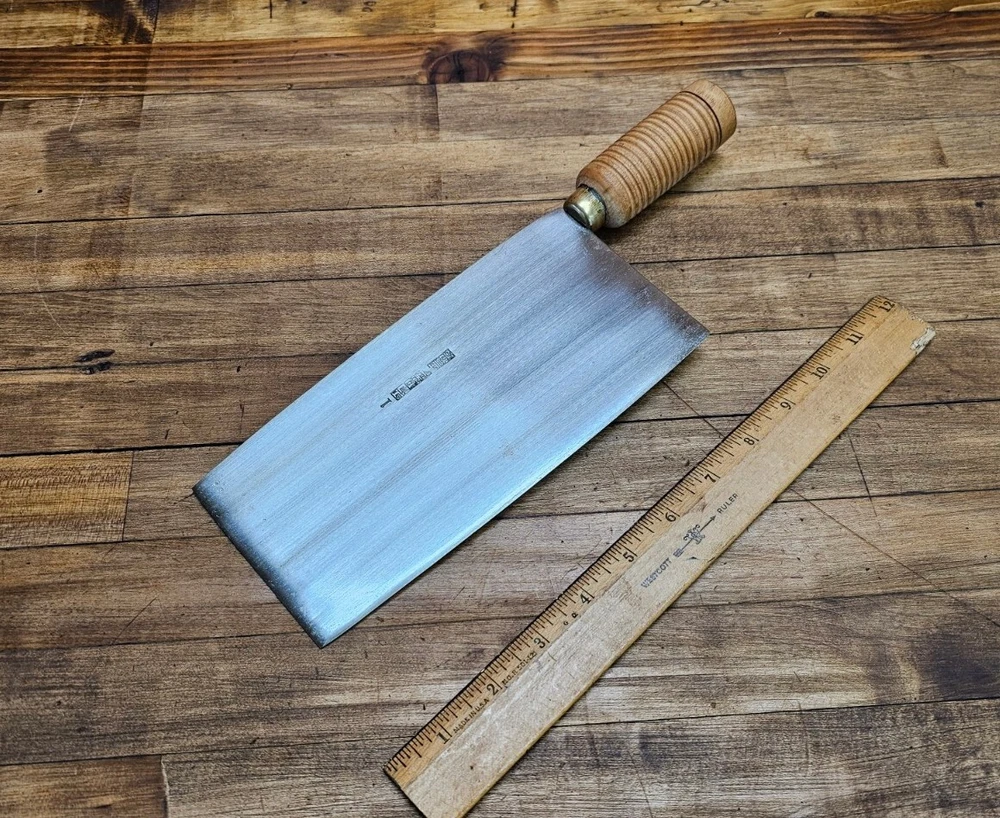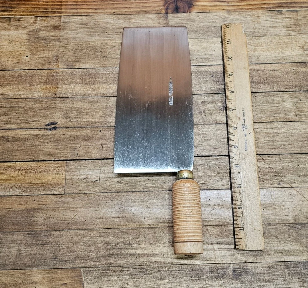 This is a rare vintage cleaver knife from San Han Nga, a renowned brand in the culinary industry, recently discovered in a storafe room at a very famous Manhattan restaurant restaurant. It is a professional-grade chef knife that is perfect for chopping and sushi making. The knife is made of high carbon stainless steel and comes with a wooden handle. It is 12.5 inches long and should be hand washed only for proper care. The set includes one knife, and it was professionally manufactured in Hong Kong in the 1960s, reflecting the cultural influences of Japan. This item is a must-have for collectors and professional chefs alike. I do combine shipping- please do not pay until your auctions have ended and I send you the final invoice. Kindly keep me updated. Thank you. Items usually will be received within 2 business days after the payment is made. Please review pictures as they offer more complete details on the items for bid. On some of my tool auctions, vintage items for bid have been cleaned for purposes of photo taking, though you may desire to clean them further or leave the patina. Any questions, please ask. While you're at it, please check out my other AFFORDABLY priced auctions. I do combine shipping, just message me. As always, thank you!