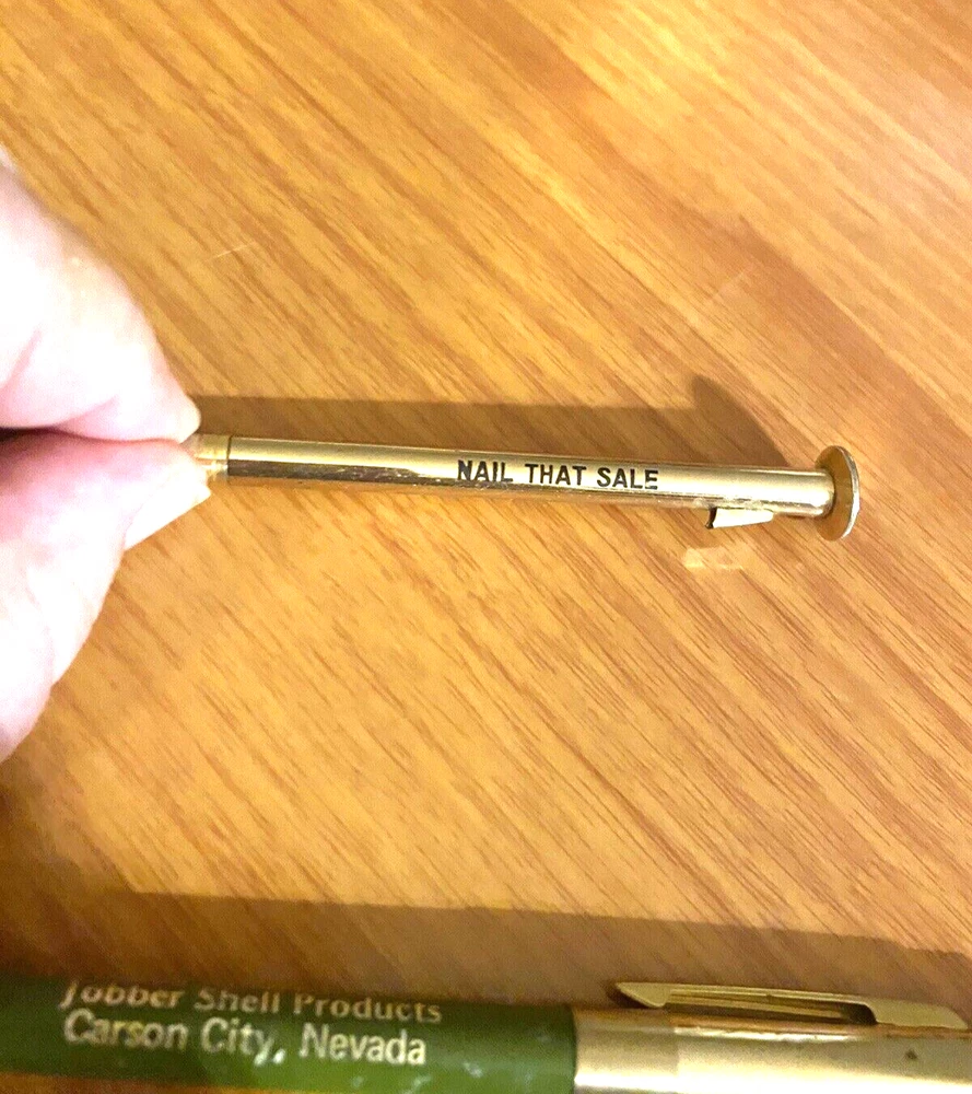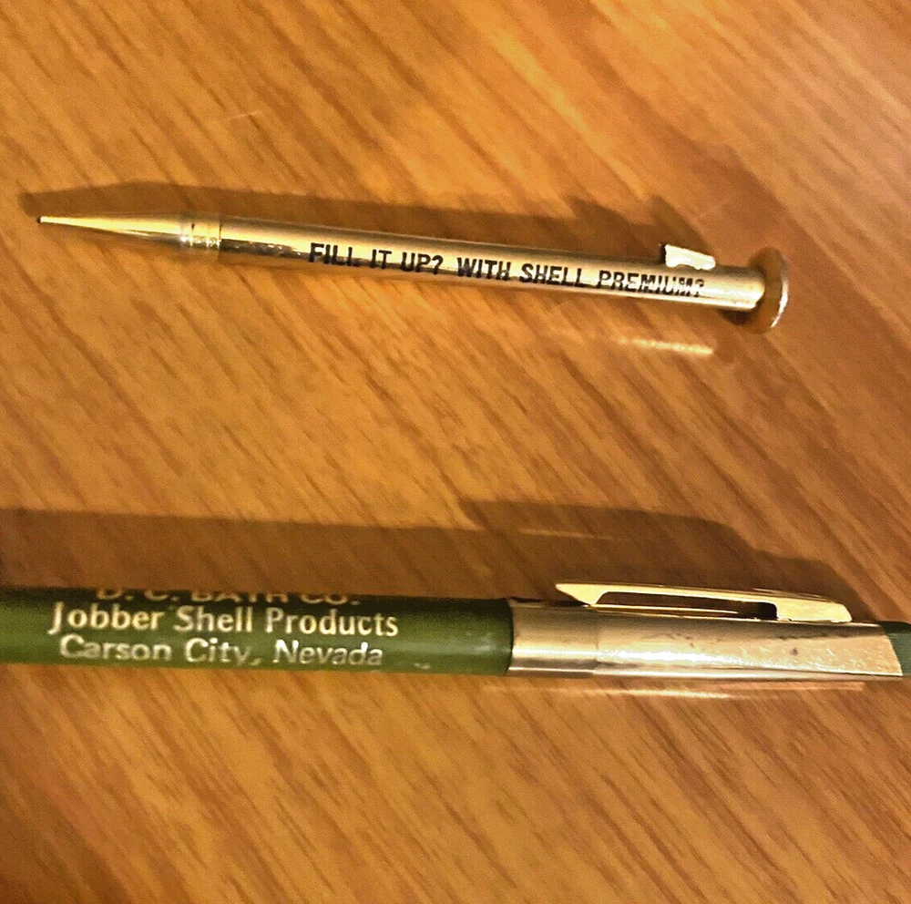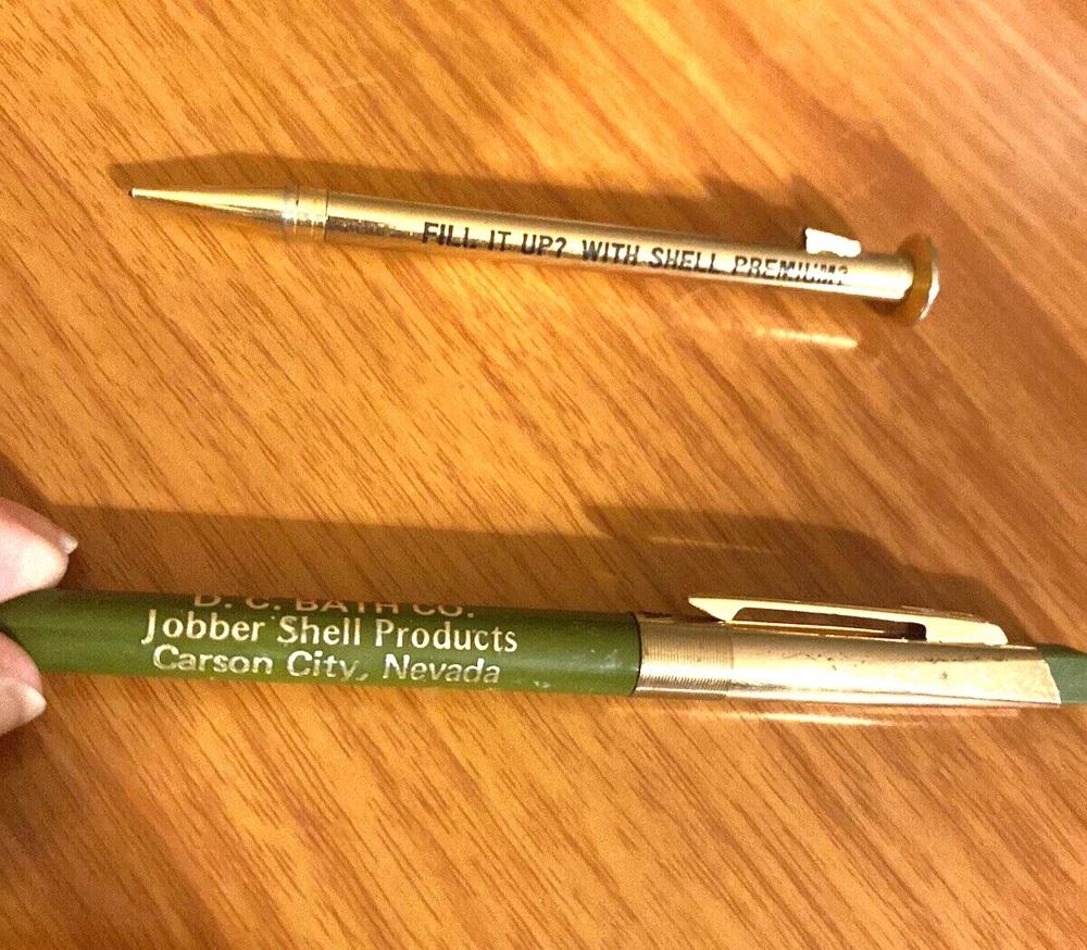 Wow these are so rare as pen or pencil and also the audience the Advertising is aimed is Shell Vendors not Shell Customers. Ballpoint pen is Wings Brand with a USA marking. Look at the clicker on the pen. The BradleyWriting Instrment made the novelty Nail Mechanical Pencil is a Nail (as is). The Pen says D.C. BATH CO. Jobber Shell Products Carson City, Nevada The Mechanical pencil says FILL IT UP? SHELL PREMIUM? NAIL THAT SALE I will be listing many more Shell items that a Shell Auditor had in his estate, they are rare and have provenance. I will provide that for the set above if interested.
