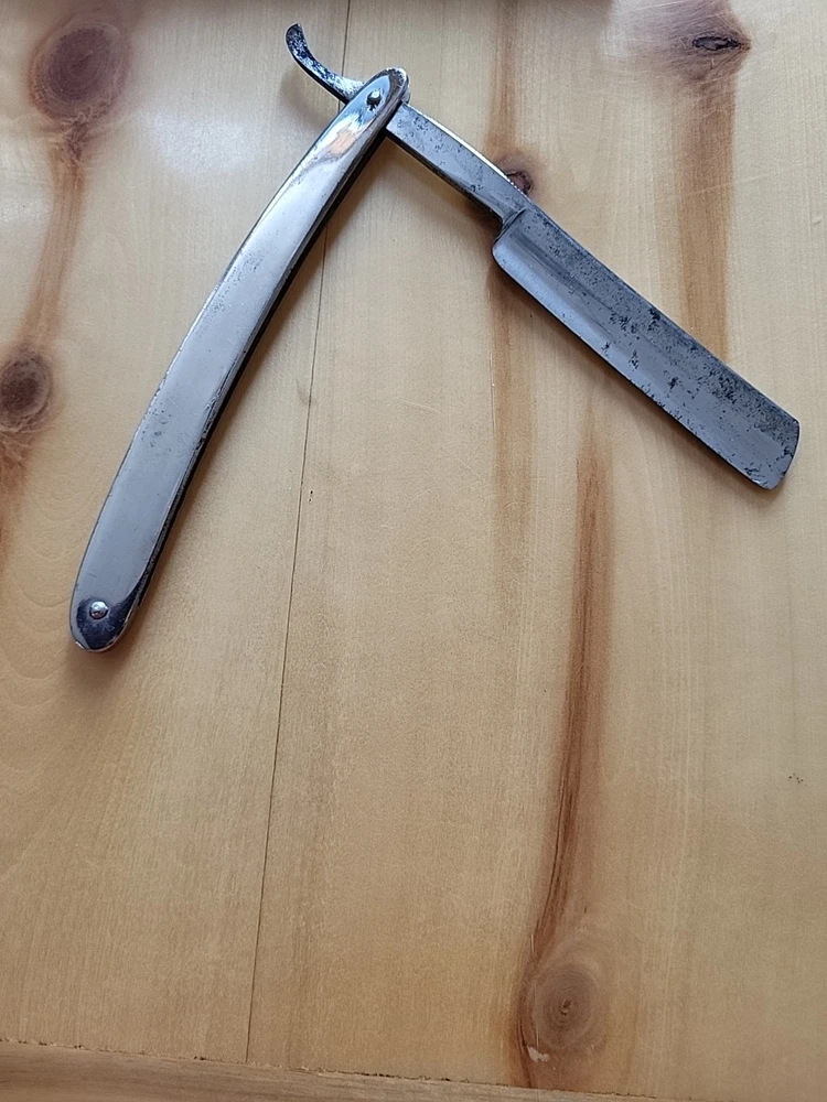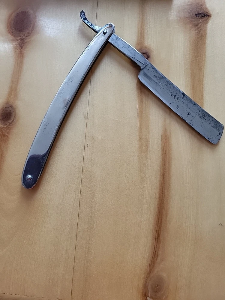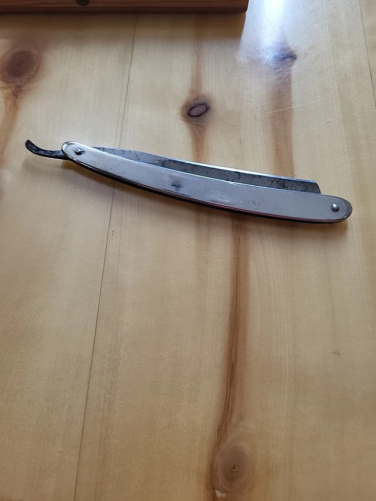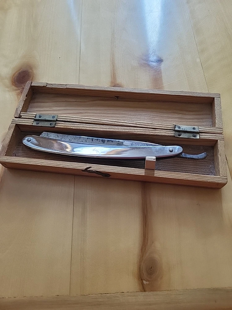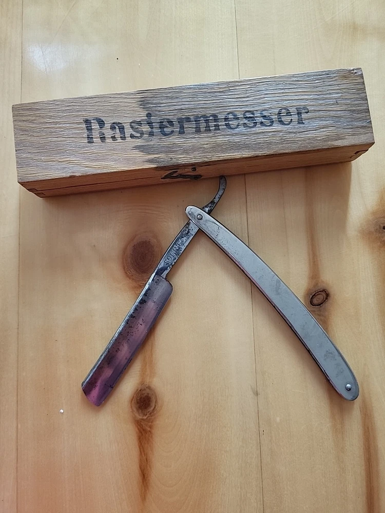 This is a handmade straight razor made in Solingen, Germany by Rasiermesser SOLINGEN. It is a high-quality grooming tool for shaving. there is some rust on the blade. see pictures.