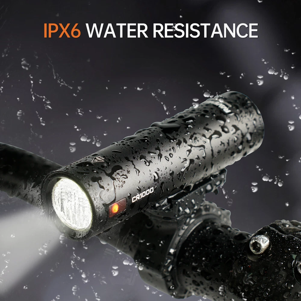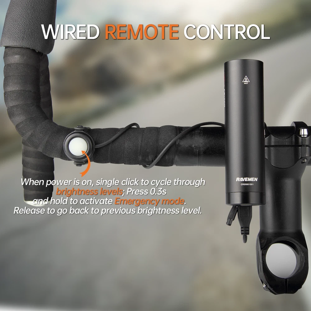 Color ‎Black Brand ‎Ravemen Material ‎Aluminum, Plastic Power Source ‎micro usb rechargeable Water Resistance Level ‎Waterproof Item Weight ‎4.96 ounces Mounting Type ‎Handlebar Mount Number of settings ‎3 Brightness ‎1000 Lumens Auto Part Position ‎Front International Protection Rating ‎IPX6 Item Package Dimensions L x W x H ‎7.48 x 3.98 x 1.46 inches Package Weight ‎0.21 Kilograms Brand Name ‎Ravemen Warranty Description ‎2 year warranty Model Name ‎CR1000 Suggested Users ‎unisex-adult Manufacturer ‎RAVEMEN Included Components ‎front bike light, usb cable, wired remote button 【Anti-Glare Lens With T-Shaped Beam】 Adopting the second generation of RAVEMEN anti-glare lens, CR1000 usb rechargeable bike light creates a T-shaped beam with close-range flood light and long-distance spotlight to be friendly seen and see better, suitable for daily commuting and road cycling. 【Wired Remote Button】 Change the brightness levels safely without releasing the grip during riding; Long press to activate max output for signaling or emergency needs. 【Brightness Level and Run Time】 High-1000lm-2hrs; Mid-600lm-3hrs; Low-300lm-6hrs; Eco-150lm-15hrs; Pulse flashing-500lm-33hrs; Rapid flashing-150lm-21hrs; Emergency mode-1000lm; Note: The above data may vary by environment and user conditions. 【Battery Runtime Extension】 Extend the runtime of the bicycle light by connecting with external power source for emergency lighting when the light is in low power, no worry to be left in darkness. 【Easy Installation Without Tools】 By adopting a movable bracket, the illuminating direction can be adjusted horizontally to 3 levels (10 degrees left,10 degrees front,10 degrees right). CR1000 bike headlight comes with a special rubber snap-on bracket that fits handlebars from 22.2mm to 35mm (regular round or irregular). 【Integrated Self-Contained Design】 Weights only 137g, CR1000 road bike light is designed to be compact and light weight with quick release function for convenient daily use, adding no burden to your journey. 【Built To Last】 CR1000 bike front light is tested to be IPX6 waterproof and is ready for all your adventures even on rainy days; Shelled with anodized aluminum body,the cycling bike light can company you for a long journey. 【Dual Side Visibility】 Increase your side visibility and riding safety at crossroads; It fits a handlebar of 22.2mm to 35mm in diameter; Wired remote: Change the brightness levels safely without releasing the grip; Long press to activate max output for signaling or emergency; Not support to turn on/ off the light using the remote. Product Features 1.Anti- glare lens with T - shaped beam, providing close - range flood light and long - distance spotlight 2. Extending battery runtime by connecting with external power source 3. Wired remote button to change brightness level safely without releasing the grip 4. USB charging port, compatible with most phone chargers 5. Intelligent memory circuit remembers the last used brightness level and mode when turned on again 6.Battery level and charging indicators and auto power save mode in low battery 7. Quick release design for easily slide in and out 8. Compatible with handlebar of 22.2mm to 35mm diameter 9:4000mAH high capacity battery for long runtime Tech Specifications LED :1' high - efficiency white LED Battery :4000mAh/3.6V rechargeable Lithium - ion battery Dimensions (Headlight):104mm(L )29mm(W)*32mm(H) Weight (Headlight):137g Materials: The front and main body is made by aluminum with Mil Type III Hard Coat Anodizing; the rear part and the handlebar mount are made by durable plastic Design and specifications are subject to change without notice The package includes: 1*Ravemen CR1000 lamp 1*S nap-on Bracket 1*Wired Remote Controller 1*Charging cable 1*manual 1*AUB01 On 19-May-2025 at 11:35:29 BST, seller added the following information: