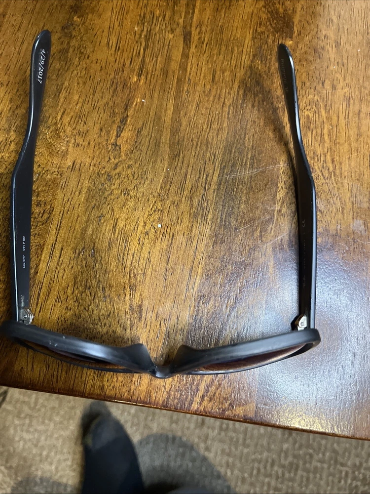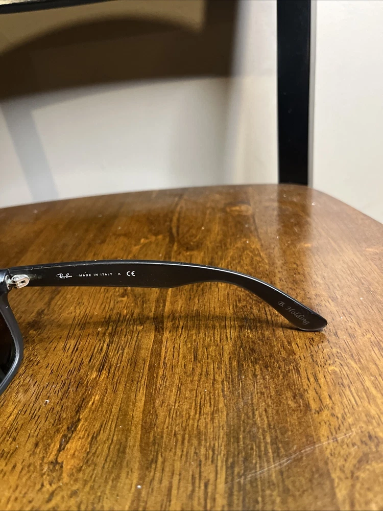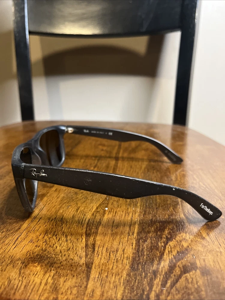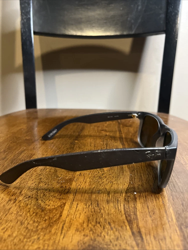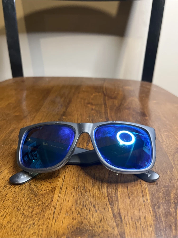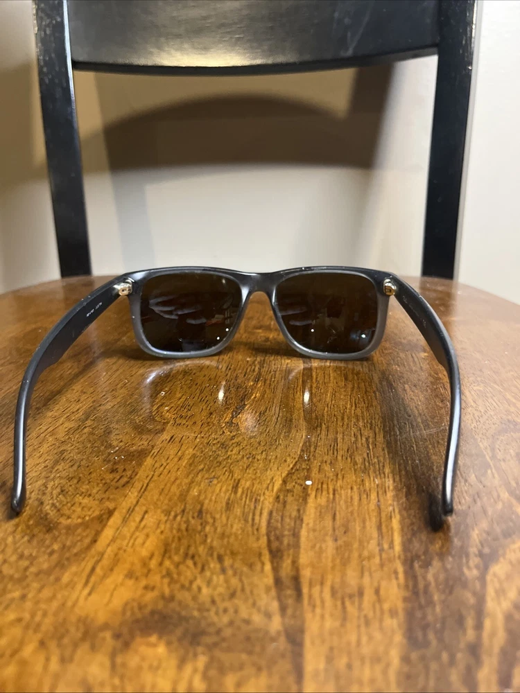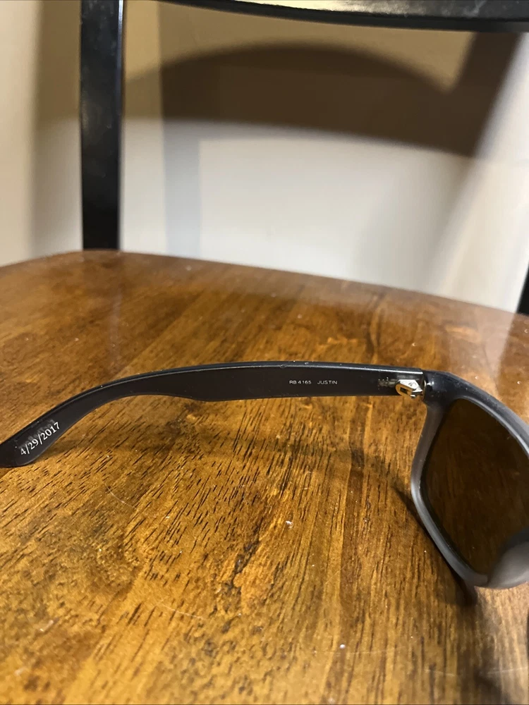 Upgrade your style with these classic Ray-Ban Justin RB4165 sunglasses frames. The frames are made of lightweight plastic material which makes them comfortable to wear for a long time. The sunglasses offer 100% UVA and UVB protection, making them ideal for use during sunny days. The lenses are polarized and tinted, providing additional protection against glare and brightness. The sunglasses have a rectangular shape and are designed for men. The frame color is black, and the lenses are gray. The sunglasses are made in Italy and have a temple length of 145mm. These sunglasses are perfect for anyone looking for a vintage and stylish pair of sunglasses. These are used. The integrity of these are good but do have some scratches here and there. Also have some engraving in side of arms from previous owner. See pics