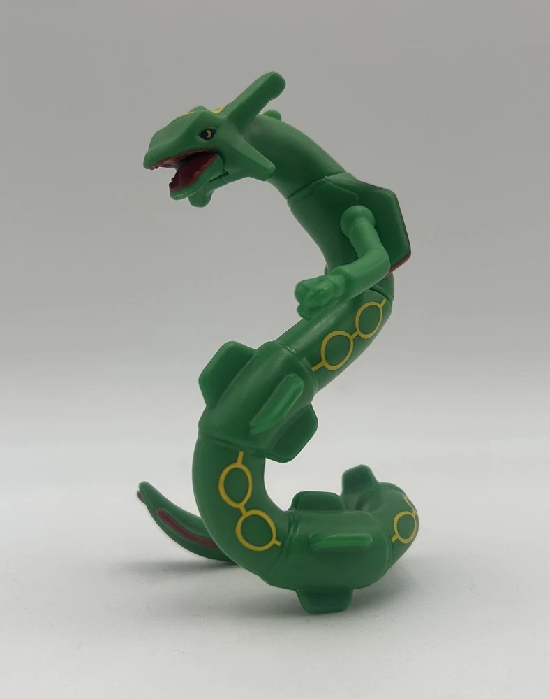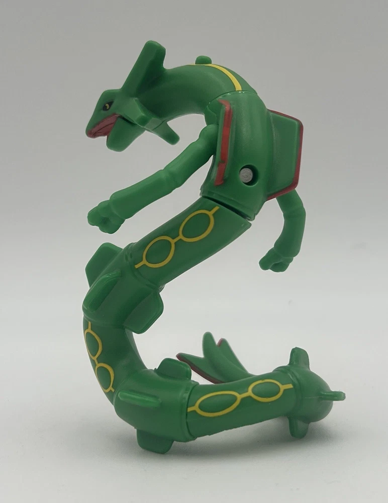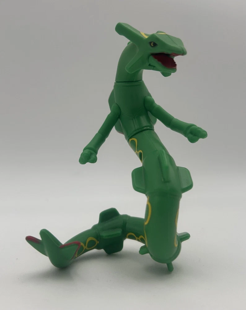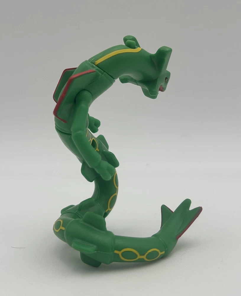 This RAYQUAZA Pokemon figure stands at 5 inches tall and is a 2015 McDonald's Happy Meal toy collectible. With its emerald color and detailed design, this stuffed animal is perfect for any Pokemon fan or collector. Made by McDonald's, this vintage toy is a must-have for anyone who loves the popular franchise. Bring back memories of childhood with this rare find. Don't miss out on the chance to add this unique piece to your collection.