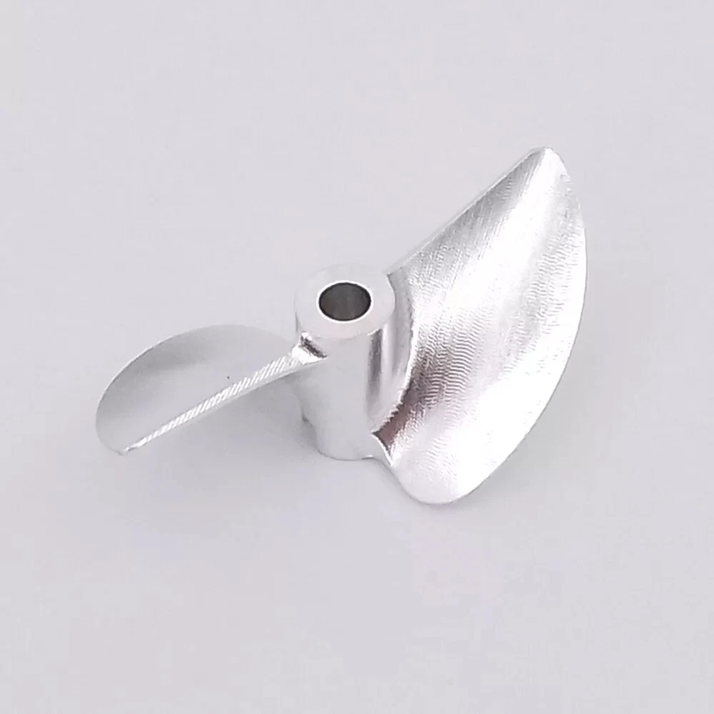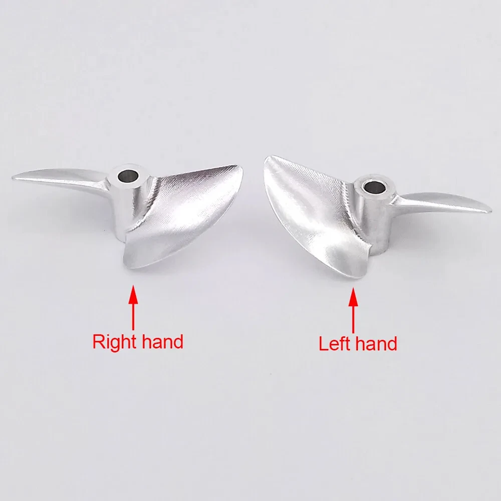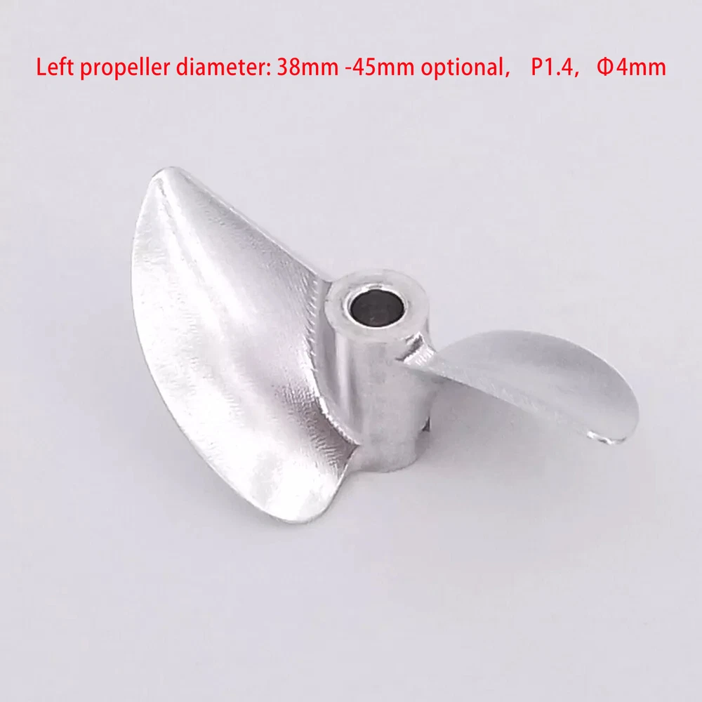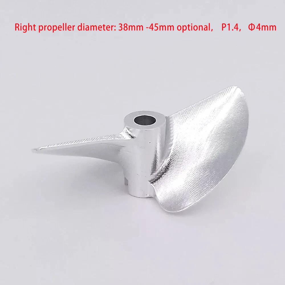 RC Boat Propeller 4mm 38mm 40mm 42mm 2-blades Aluminum Prop P1.4 for RC Racing Boat Description There propeller Suit for brush-less RC speed boat, RC racing boat upgrade spare part. Made of aluminum alloy, made by CNC.It is balanced,sharp and hard. There are two sizes available, please choose the correct size for your boat before purchasing. Tips Right-Hand(RH): which rotates clockwise as viewed from the stern when in forward gear Left-Hand(LH): which rotates counter clockwise as viewed from the stern when in forward gear ? Specification & Features * Material: aluminum alloy( 7075 ) * Hub hole diameter: 4mm, Fit 4mm shaft * Propellers diameter: 38mm/39mm/40mm/41mm/42mm/43mm/44mm/45mm optional * Propellers types: Left-hand, right-hand optional * Bayonet size:3mmx3mm * Pitch ratio: 1.4 ? Item Contains 1 Piece of CNC aluminum RC boat propeller for 4mm shaft( Diameter and propeller types optional )