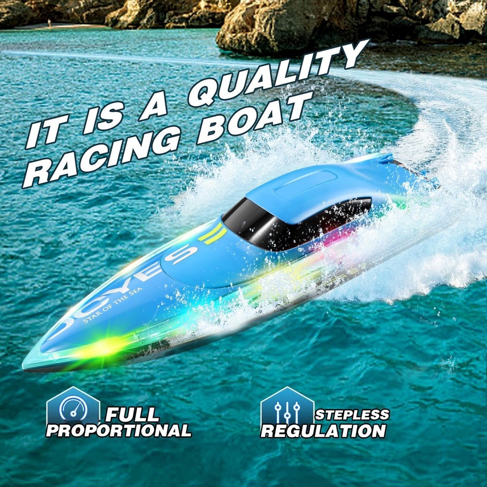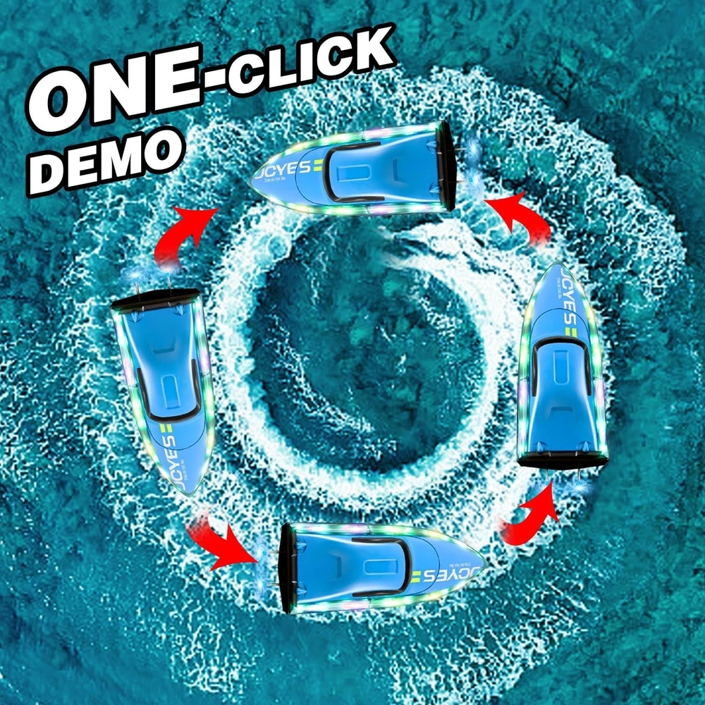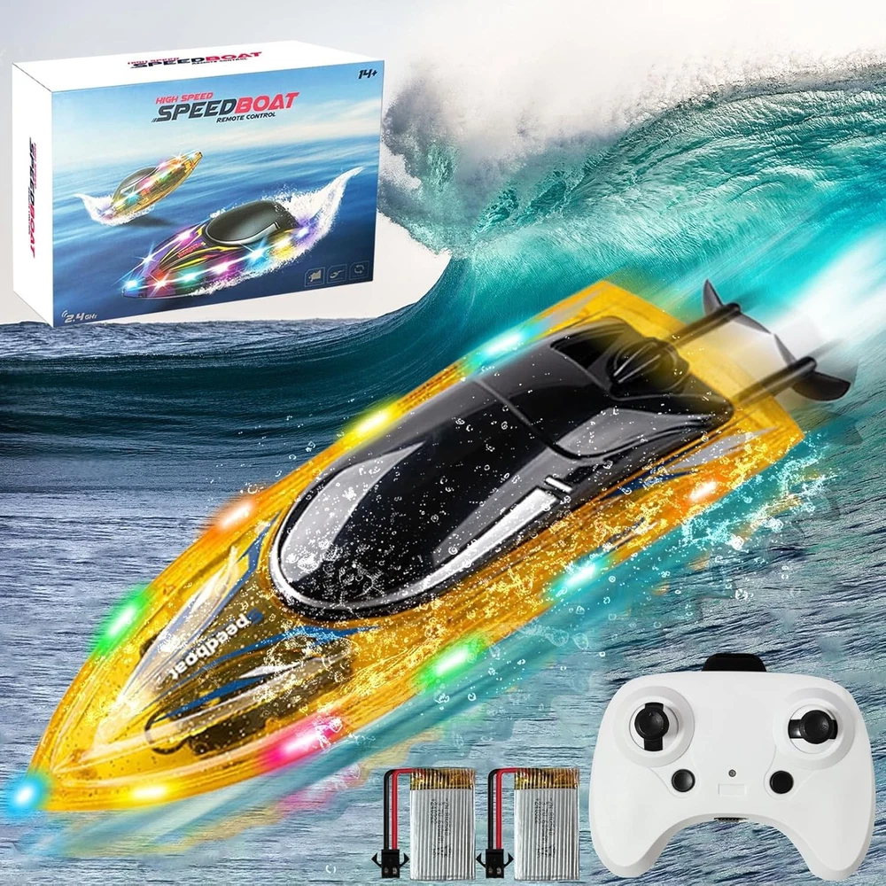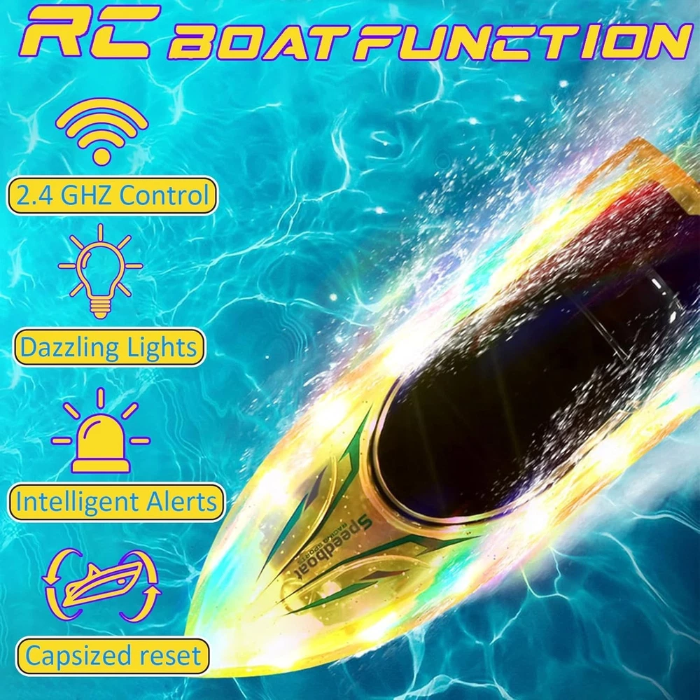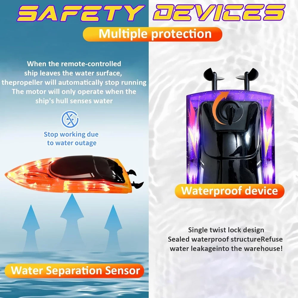 MODLE 1 High - Speed Thrills: Experience an exhilarating ride with this 2.4GHZ RC boat, capable of reaching speeds up to 30KMH. Perfect for both adults and kids aged 8 - 12, it offers endless high - speed fun on pools and lakes, providing an exciting water adventure every time. Eye - Catching Design: Stand out on the water with the built - in LED lights that illuminate the boat, creating a stunning visual display during both day and night play. The vibrant lighting adds a magical touch to your water play sessions. Ultra-Long Battery Life: Double your playtime with 2 rechargeable batteries—get up to 60 minutes of non - stop fun! This remote control boat’s extended battery life ensures long - lasting aquatic adventures, while its rugged design guarantees durability through countless high - speed races on pools and lakes. All - Round Compatibility: This remote control boat is designed for versatile use in various water bodies, from backyard pools to expansive lakes. Its 2.4GHz frequency ensures stable and interference - free control, allowing multiple boats to race simultaneously. Great Gift Choice: Whether for boys or girls, this RC boat makes an excellent water play toy gift. It combines entertainment and excitement, making it a memorable present for birthdays, holidays, or any special occasion for kids and adults alike. MODLE 2 【200ft Long-Range 2.4GHz Control】The advanced 2.4GHz remote technology ensures interference-free operation within a 200ft radius, providing stable signal transmission for confident navigation across lakes, ponds, and swimming pools 【2 Rechargeable Batteries for RC Boat】Equipped with two 3.7V 600 mAh rechargeable batteries for your remote control boat, allowing continuous fun by swapping batteries. Enjoy up to 40 minutes of runtime while the spare battery charges, eliminating long waiting periods 【2-Speed Modes & 20km/h High Velocity】Experience thrilling aquatic adventures with our RC boat's dual-speed control. Switch between beginner-friendly low speed for precise maneuvering and pulse-racing high speed reaching 20km/h for adrenaline-charged performance 【Full Waterproof Protection】Built with complete waterproof electronics compartment and IPX5-rated hull design, this remote control boat withstands splashes, light rain, and accidental submersion for worry-free water adventures 【Smart Auto-Shutoff Safety Feature】Integrated water exit detection automatically stops propeller rotation when the boat leaves water surface, preventing motor damage and ensuring operational safety during retrieval 【Cool LED Lights】The RC boat has three light modes, you can set your favorite light, and you can see your RC boat clearly at night 【Low Battery Warning】When the power of the RC boat is too low, it will trigger the insufficient power alarm function to return the boat to its original position 【Anti-capsize】The RC boat has anti-capsize function, you don't need to worry about the boat capsizing during the entertainment process, the RC boat can recover by itself