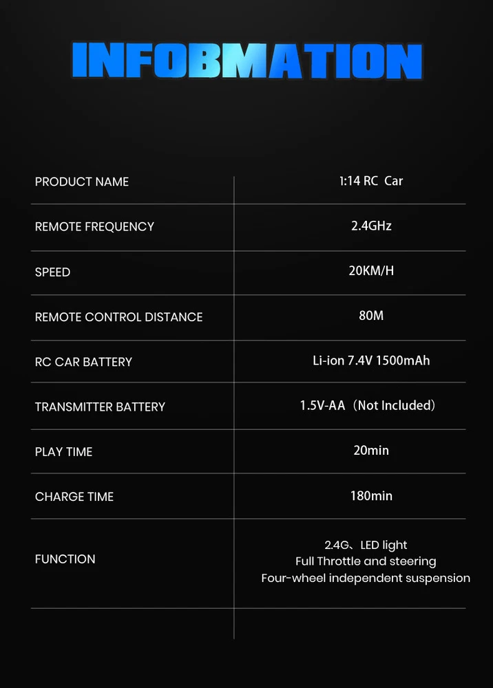 You may also like Product Description Metal Components The hobby grade and the chassis is well designed, meaning the rc vehicle can take a real beating. POWERFUL 390 MOTOR The rc truck has powerful 390 MOTOR, so it's great fun even on rough or rugged terrain. WATERPROOF Splash waterproof esc receiver. speed controller and receiver are combined. GREAT for BEGINNERS It is very tough and durable you don't have to worry about breaking the RC car when you drive it. The Radio Control Cars for boys and adults will run for up to 40 minutes at a time. GREAT SUSPESION Stronger rc cars shocks to prevent too much bouncing and the dampers do their job well 1:14 Realistic Scale : It bigger than 1:16 1:18 ,the toys cars made of safety, non-toxic, anti- collision and anti-impact material;Tough Rubber Wheels give the fast remote control car effective traction for bashing on almost any terrain. Excellent Performance: Powered with superb and fast brushed RC 390 motor in unceasingly efficient drivetrain , this 4WD rc cars bursts out at 40+kph(25+ mph) for adults,you'll be amazed by this toys monster truck. Stronger and Durable Built: Built with a steel chassis shaft structure and an independently stimulated shockproof system that reduces impact on unsteady drives.After that the top of car shell body come with reinstance bumper,this can be very effective in preventing the car from falling backwards resulting in unnecessary damage; About Us Payment Shipping Terms Contact Us 1.We are honest eBay sellers. 2.We offer best price products to worldwide. Office time: Monday to Saturday, CST: 9:30-18:30 1. We ONLY accept PayPal. 2.Payment must be received within 7 days after winning the item. To claim back the Final Value Fee from eBay, an UPI (Unpaid Item Case) will be filed automatically if buyers fail to make the payment in 7 days after item ends. 3.If you have any problem with the payment after bidding, please let us know within 24h via eBay message. Thank you! 1. USA Stock, we ship from USA . 2. All packages will be shipped within 1-2 business day . 3. We will provide a tracking number. 4. Please note that there are certain circumstances that we unfortunately can not have control i.e. weather condition, delay by post office, Sundays, National Holidays, etc. 5. We don't arrange shipment on weekends. We appreciate your great understanding. 1. Free 30 day returns. We accept return and exchange. 2. Please read the detail of listing before you purchase it. If you have any problem with the listing, feel free to contact us firstly. 3. Returned item must be in brand-new, un-used, undamaged and re-sellable condition, including original packaging and complete accessories that came with the item (with all tags and labels attached). If the item is returned damaged, or has been opened or used, we may issue a partial refund in accordance to its condition and the issue. Returned item will be refused if it contains any scratches, dirt, or sign of usage. 4.All the items are double checked before shipment, If item is damaged, defective or missing components upon arrival, please provide us photos of the damaged package or defective item, we will respond you within 24 hours and resolve your issue asap. 1.Please contact us via eBay message. 2.Since you and us may located in the different time zones, please allow us to respond you within 24 hours on office time. we will respond you within 48 hours on holidays. 3.We are doing our best to offer you a better shopping impression on eBay. If you have any issue about the transaction, feel free to contact us before opening eBay case, PayPal case and leaving Neutral feedback or Negative feedback, we will resolve your issue properly. About Us 1.We are honest eBay sellers. 2.We offer best price products to worldwide. Office time: Monday to Saturday, CST: 9:30-18:30 Payment 1. We ONLY accept PayPal. 2.Payment must be received within 7 days after winning the item. To claim back the Final Value Fee from eBay, an UPI (Unpaid Item Case) will be filed automatically if buyers fail to make the payment in 7 days after item ends. 3.If you have any problem with the payment after bidding, please let us know within 24h via eBay message. Thank you! Shipping 1. USA Stock, we ship from USA . 2. All packages will be shipped within 1-2 business day . 3. We will provide a tracking number. 4. Please note that there are certain circumstances that we unfortunately can not have control i.e. weather condition, delay by post office, Sundays, National Holidays, etc. 5. We don't arrange shipment on weekends. We appreciate your great understanding. Terms 1. Free 30 day returns. We accept return and exchange. 2. Please read the detail of listing before you purchase it. If you have any problem with the listing, feel free to contact us firstly. 3. Returned item must be in brand-new, un-used, undamaged and re-sellable condition, including original packaging and complete accessories that came with the item (with all tags and labels attached). If the item is returned damaged, or has been opened or used, we may issue a partial refund in accordance to its condition and the issue. Returned item will be refused if it contains any scratches, dirt, or sign of usage. 4.All the items are double checked before shipment, If item is damaged, defective or missing components upon arrival, please provide us photos of the damaged package or defective item, we will respond you within 24 hours and resolve your issue asap. Contact Us 1.Please contact us via eBay message. 2.Since you and us may located in the different time zones, please allow us to respond you within 24 hours on office time. we will respond you within 48 hours on holidays. 3.We are doing our best to offer you a better shopping impression on eBay. If you have any issue about the transaction, feel free to contact us before opening eBay case, PayPal case and leaving Neutral feedback or Negative feedback, we will resolve your issue properly. powered by