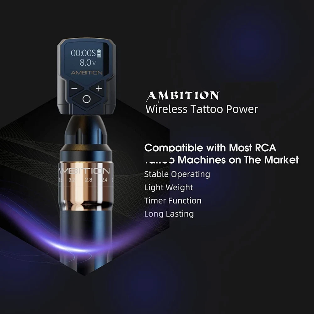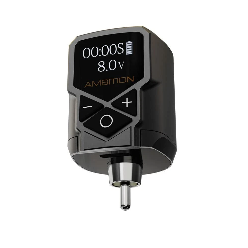 Descriptions: Material: Ambition Tattoo Power Supply made of aluminium alloy frame and high quality acrylic, the size is small, light weight(57g/2oz), length: 1.49inches, width: 0.98inches, easy to carry so that you can do tattoo work outdoors. High-quality Lithium Battery: The wireless tattoo power supply capacity is 2400mAh, the working voltage is 4-12V, the adjustment is ±0.1V. Fast charging, can be full state in 2 hours.The LED screen displays the working voltage, working time and remaining power. Support Jumpstart: 12V jumpstart function,double-click the power button to turn on(J)/turn off(S) the jumpstart, support your machine to defeat the stiffest of cartridge needle membranes. Compatible with most RCA tattoo machines. Long-lasting Power Pack: Under normal 8V voltage, the voltage stable state can last for 6 hours,long time working the voltage is stable. More convenient and quick to adjust the output voltage. Suitable for most brands of tattoo pens machine, liner and shader. Features: The simplicity and portability opration of Ambition wireless tattoo power will help you to conquer your tattoo. Material : aluminium alloy+high quality insulating plastic+silicone keys. Connector :RCA Battery Capacity: 2400mAh Charging time : About 2 hours Operation time : Under normal 8V voltage, the voltage stable state can last for 6 hours,long time working the voltage is stable. Output voltage : 4-12V, ±0.1V LED display content: output voltage range + battery usage+working time Instructions for use: Power ON/OFF: Long press "O" key for 3 seconds Output pause / resume: Short press "O" key to pause the output, and short press it again to resume the output (the resume voltage is the working voltage before the pause). Adjust output voltage: Press the "+" or"-" key to adjust output voltage. 12V jumpstart function,double-click the power button to turn on(J)/turn off(S) the jumpstart. Power: The LED display will show the remaining power, and the full power will display 4 divisions. Fast charging through the matching fast-charging cable can usually be fully charged in 2 hours. Please pay attention to the change of power at any time to prevent sudden power loss from affecting your tattooing work. Package Include: 1x Wireless tattoo power 1x tattoo power cable 1x storage zipper box SKU# Shipping Weight: 7oz Net Weight: 5.71oz MC.BD.314 2 - PADDED FR ENVELOPE 4 - REGIONAL BOX A 10 - MEDIUM FR BOX